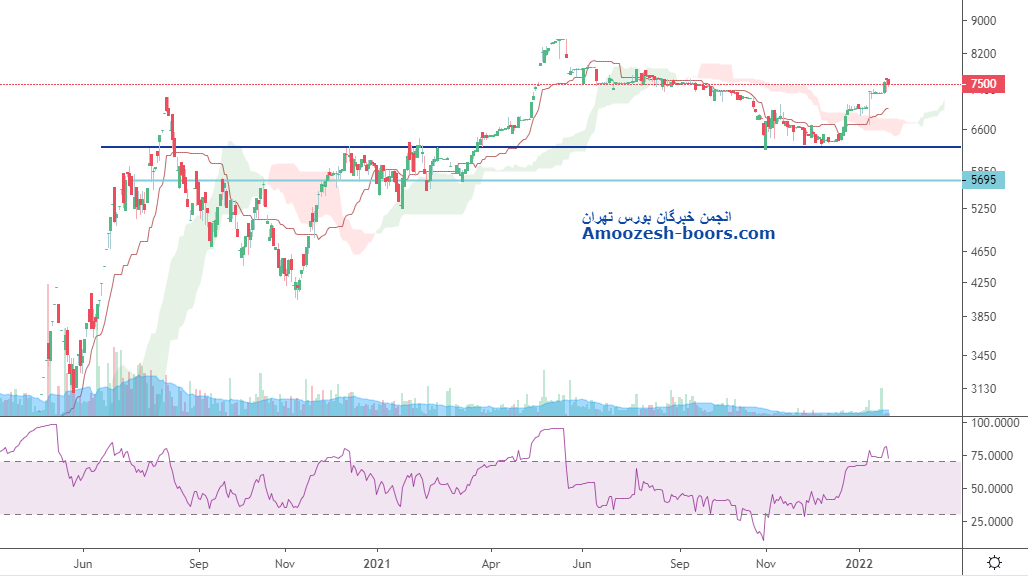 در حال حاضر قیمت در سطح مقاومتی 7500 قرار داشته و با توجه به موقعیت اوسیلاتور در منطقه اشباع خرید و افزایش حجم معاملات ، موقعیت چارت را پر ریسک نموده ، در صورت ایجاد فشار فروش حمایت 7000 و 6500 به ترتیب بر سر راه سهم قرار داشته و در صورت حفظ این منطقه تارگت 8500 در نظر گرفته خواهد شد .
