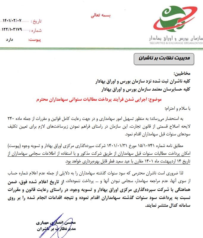 سهم وکار در خصوص پرداخت مطالبات سنواتي سهامداران خود نامه زیر را روانه کدال نموده است