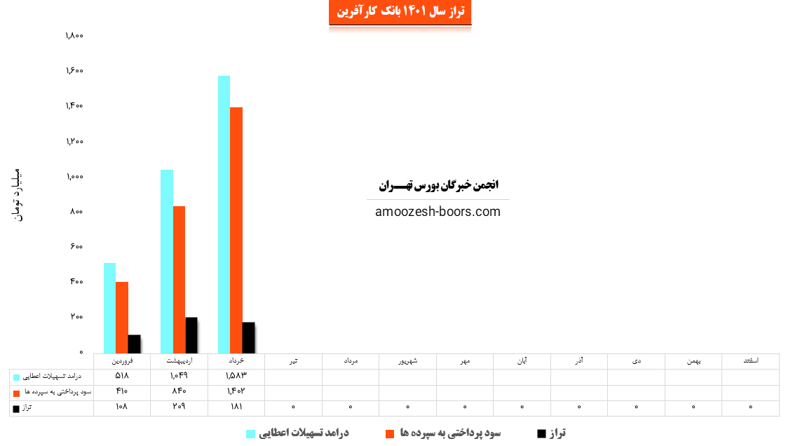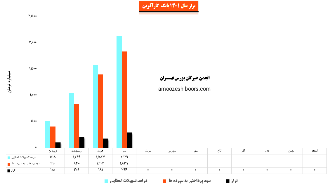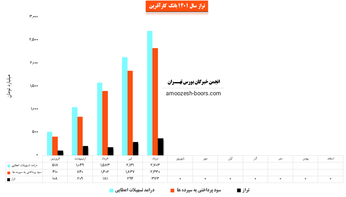 سهم وکار (بانک کارآفرین) در مهر ماه مبلغ 549.5 میلیارد تومان از محل سود تسهیلات خود درآمد داشته و مبلغ 445.5 میلیارد تومان سود سپرده پرداخت نموده است. نماد وکاردر این دوره تراز مثبت 103.9 میلیارد تومان (23%) را ثبت کرده است. تراز بانک در این دوره نسبت به ماه قبل 1% کاهش و نسبت به میانگین ماه های قبل 2% افزایش داشته است. همچنین وکار نسبت به دوره 1 ماهه مشابه سال قبل 15% کاهش تراز داشته است.
