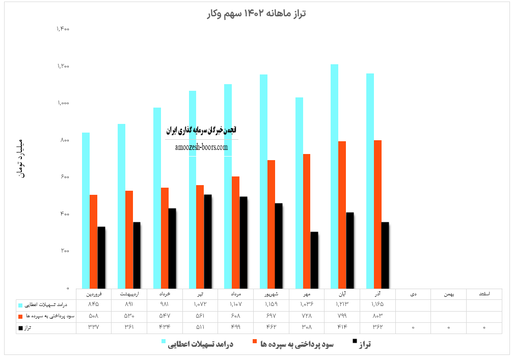 سهم وکار (بانک کارآفرین) در آذر ماه سال 1402 حدود مبلغ 1165 میلیارد تومان درآمد داشته در مقایسه با ماه گذشته 4% افت پیدا کرده است. همچنین نماد وکار در آذر ماه حدود مبلغ 803 میلیارد تومان به سپرده های خود سود پرداخت کرده این مبلغ در مقایسه با ماه گذشته حدود 1% افزایش پیدا کرده است. با توجه به آمار مذکور تراز وکار نسبت به ماه گذشته با افت 13 درصدی به مثبت 362 میلیارد تومان رسیده است.