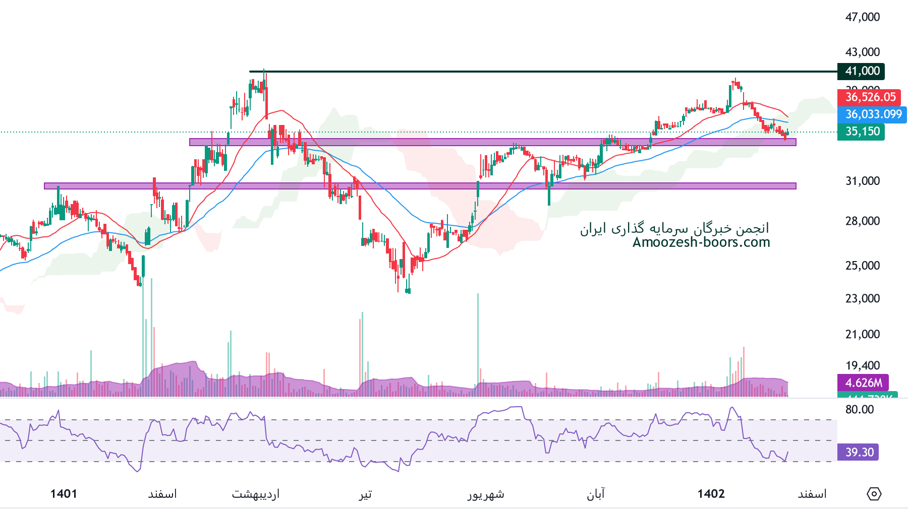 حمایت نماد پارسان از ناحیه پر تراکم 34000 ریال تشکیل شده و در صورت شکست این سطح تا حمایت بعدی سهم پارسان ( 30000 ریال ) 10% فاصله وجود دارد.
