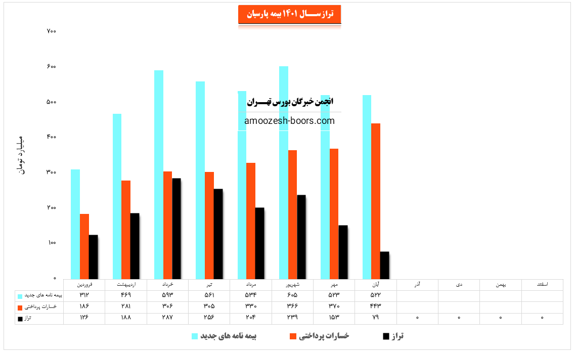 سهم پارسیان (شرکت بیمه پارسیان) در آبان ماه سال 1401 حدود مبلغ 522 میلیارد تومان بیمه نامه جدید صادر کرده که این میزان در مقایسه با ماه گذشته 1% کاهش پیدا کرده است.
