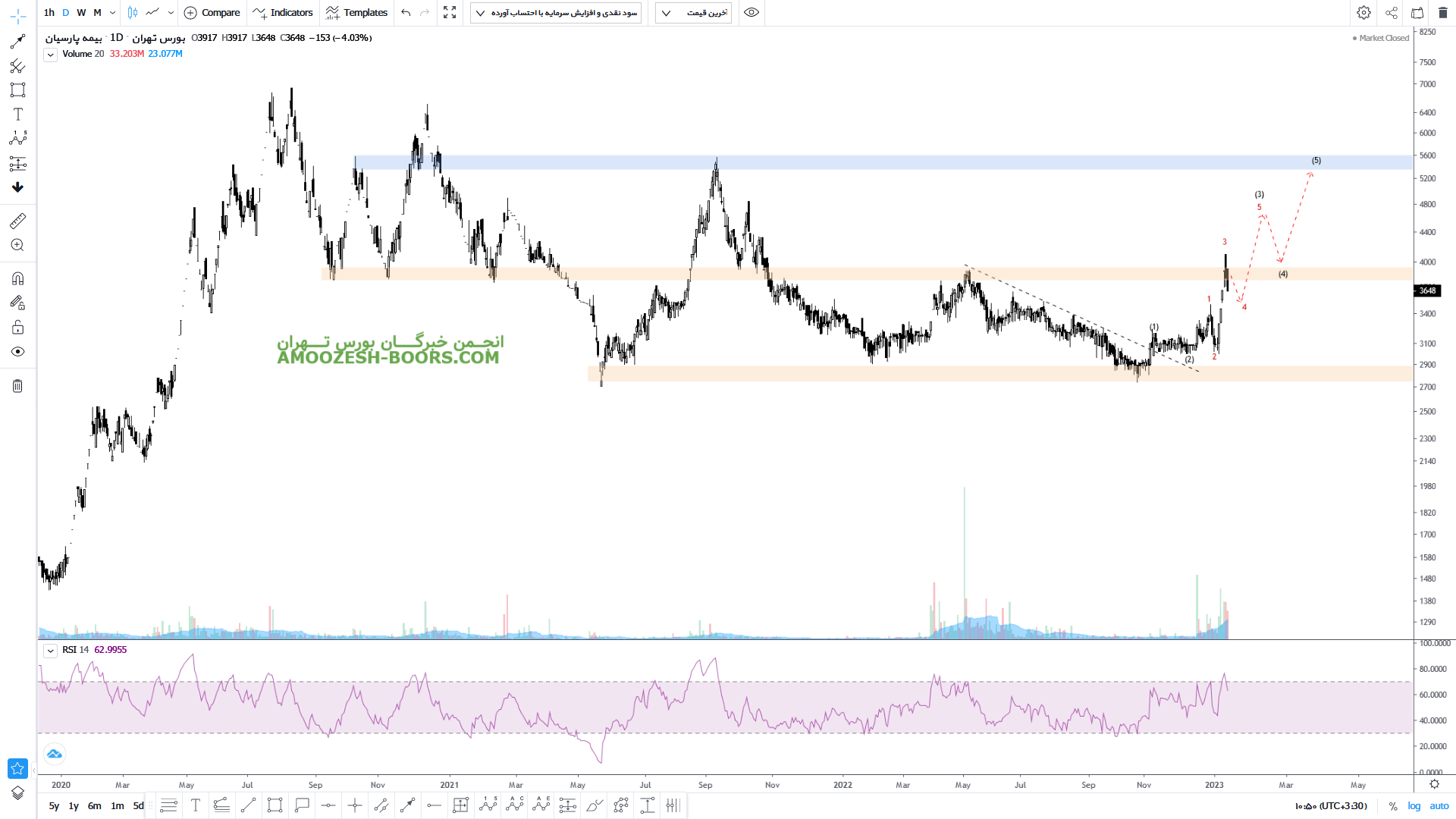 قیمت سهم بیمه پارسیان در قالب یک سیکل الیوتی جدید در حال تکمیل ریز موج های موج صعودی خود میباشد. لذا در صورت توانایی عبور قیمت از ناحیه مقاومتی ۳۹۰ تومان میتواند رشد خود را تا ناحیه مقاومتی ۵۵۰ تومان نیز ادامه دهد اما در این مسیر به جهت تکمیل ریز موج های اصلاحی خود اصلاحات کوچکی نیز خواهد داشت که منجر به زمان بر شدن این رشد خواهد شد.