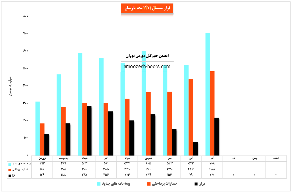 سهم پارسیان (شرکت بیمه پارسیان) در آذر ماه سال 1401 حدود مبلغ 708 میلیارد تومان بیمه نامه جدید صادر کرده که این میزان در مقایسه با ماه گذشته 36% رشد پیدا کرده است.