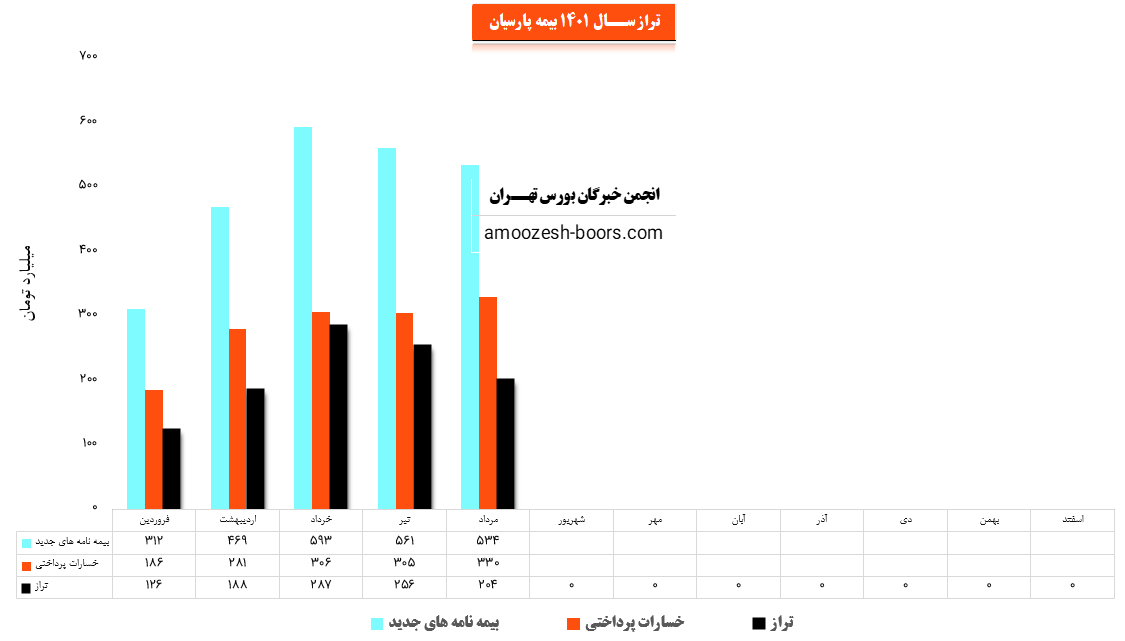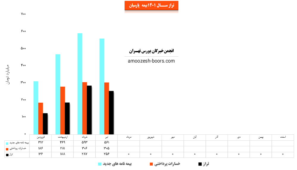 نماد پارسیان (شرکت بیمه پارسیان) در تیر ماه سال 1401 حدود مبلغ 561 میلیارد تومان بیمه نامه جدید صادر کرده که این میزان در مقایسه با ماه گذشته 5% کاهش پیدا کرده است.