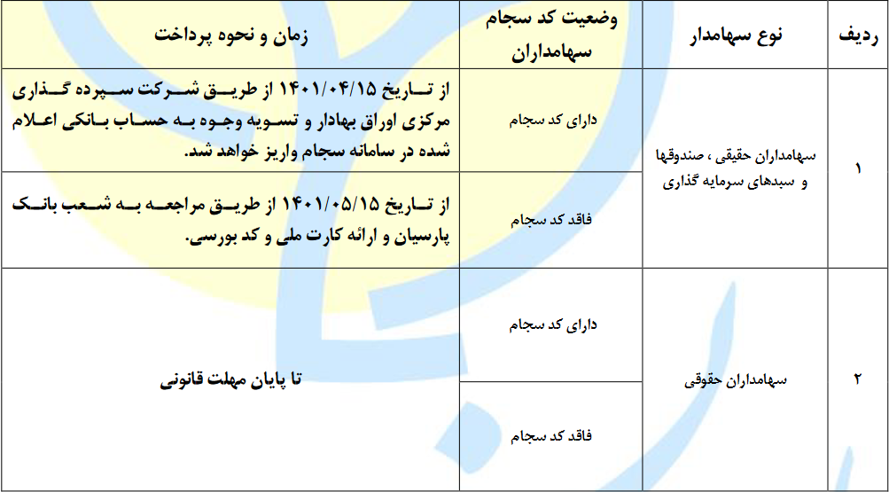 با احترام جدول زمانبندی پرداخت سود نقدی پیشنهادی هیات مدیره به شرح ذیل اعلام می گردد: