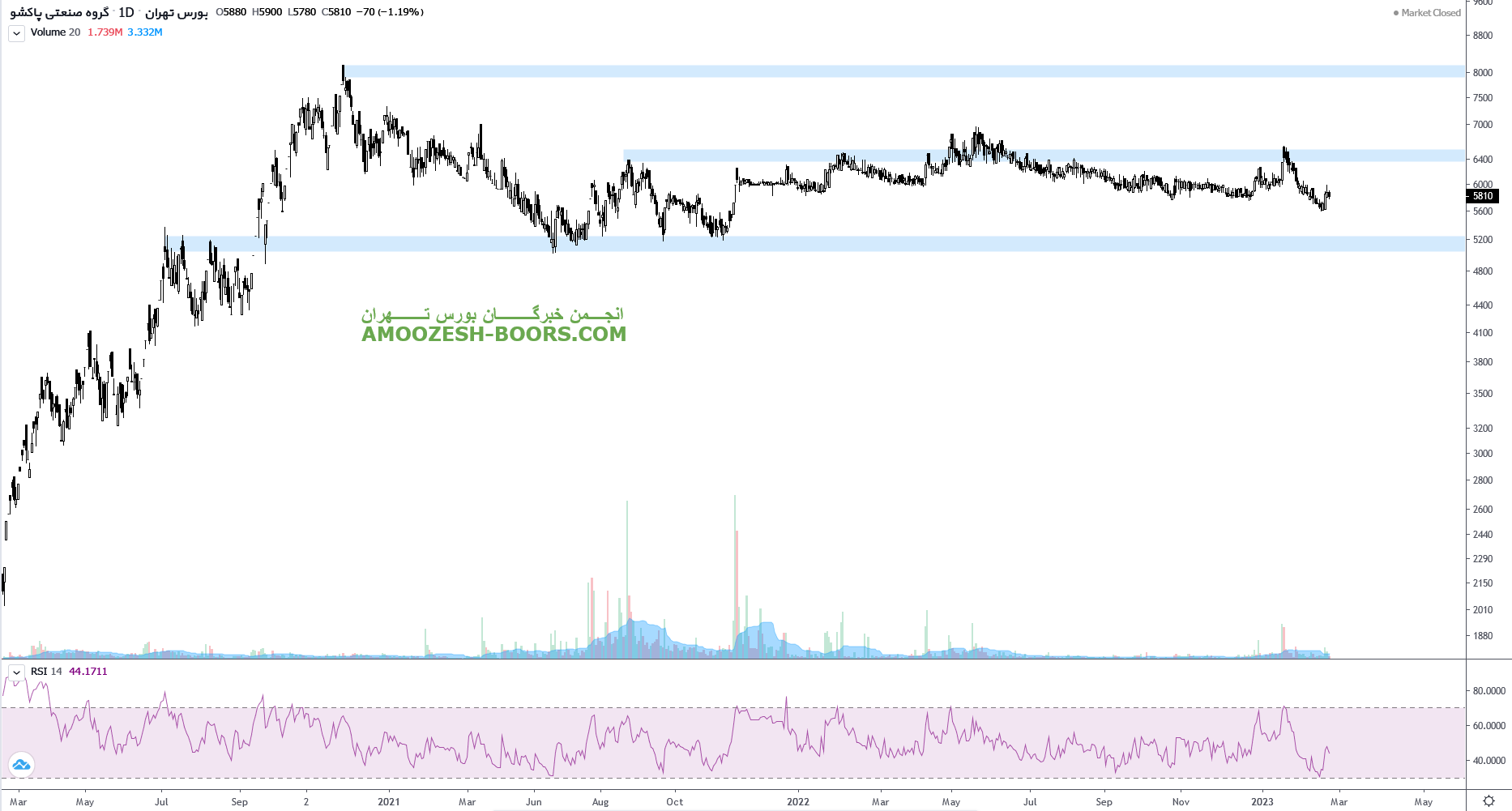 قیمت سهام پاکشو پس از بروز واکنش منفی نسبت به مقاومت ناحیه ۶۵۰ تومان وارد اصلاح شده و اکنون اولین حمایت سن پاشو ناحیه ۵۱۰ تومان در نظر گرفته شده است. در صورت رشد و شکست مقاومت مهم ناحیه ۶۵۰ تومان، مقاومت بعدی سهام پاکشو ناحیه سقف تاریخی ۸۰۰ تومان در نظر گرفته شده است.