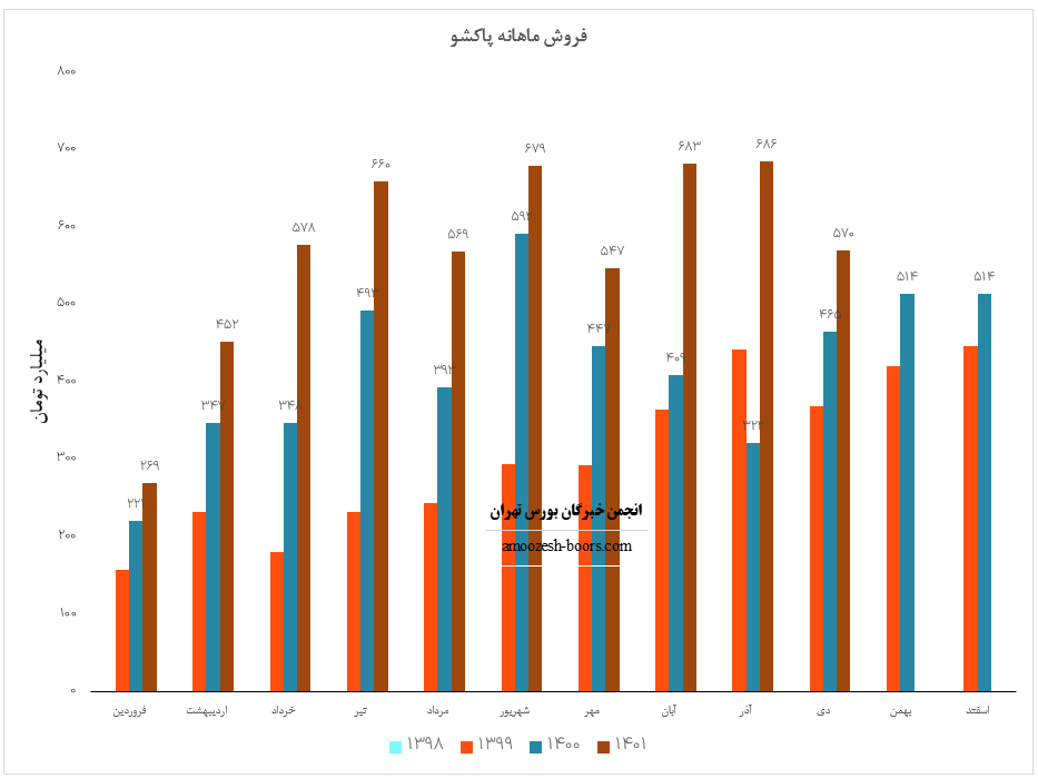 نماد پاکشو (شرکت تولیدی و شیمیایی پاکشو) در دی ماه 1401 حدود مبلغ 570 میلیارد تومان درآمد داشته که این میزان در مقایسه با ماه گذشته 17% افت و همچنین در مقایسه با مدت مشابه سال گذشته 23% رشد پیدا کرده است.