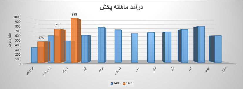 درآمد سهم پخش در این دوره نسبت به ماه قبل 9% افزایش و نسبت به میانگین ماه های قبل 28% افزایش داشته است. شرکت نسبت به دوره 1 مشابه سال قبل 98% افزایش درآمد داشته است.
