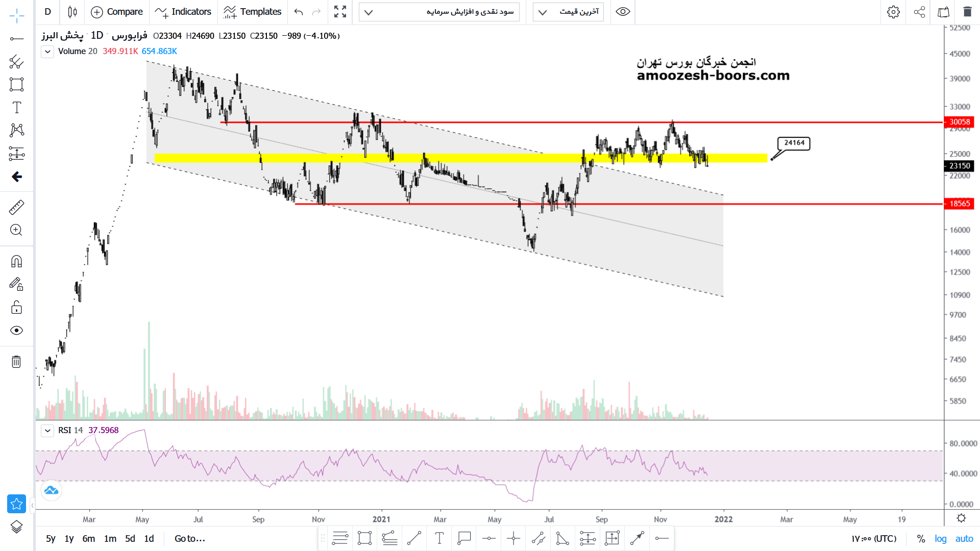 انتظار اصلاح بیشتر قیمتی سهم پخش را با توجه به شکست محدوده حمایتی 2400 تومان از سهم داریم، محدوده حمایتی بعدی که میتواند در سهم باعث ایجاد تقاضا شود محدوده حمایتی سقف کانال نزولی شکسته شده یعنی محدوه 2000 تومان میباشد