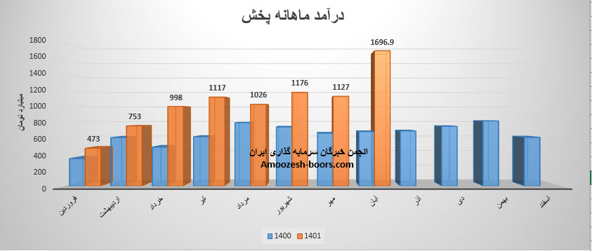 سهم پخش (شرکت پخش البرز) در دی ماه ۱۴۰۱ حدود مبلغ 1572 میلیارد تومان درآمد داشته که این میزان در مقایسه با ماه گذشته 10% کاهش و همچنین در مقایسه با مدت مشابه سال گذشته 110% افزایش پیدا کرده است.