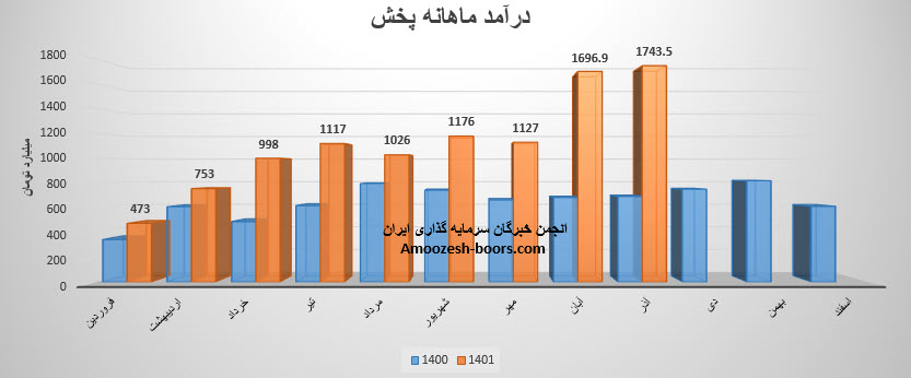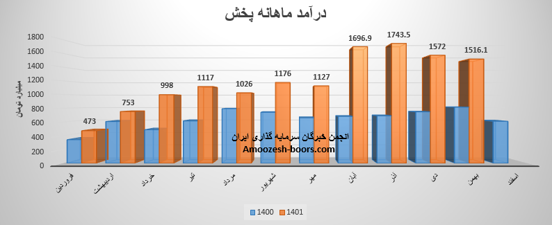 سهم پخش با کاهش 4 درصدی درآمد نسبت به ماه قبل به رقم 1516.1 میلیارد تومان دست یافت .تماما این درآمد از محل توزیع و فروش تامین گردیده است . همچنین درآمد بهمن ماه نماد پخش نسبت به متوسط ماهانه 30 درصد و نسبت به مدت مشابه 86 درصد بیشتر گزارش شده است .
