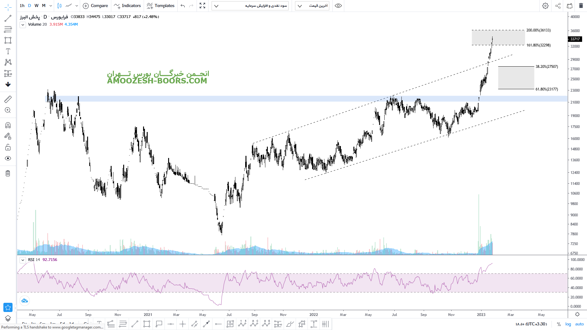نماد پخش در حال حرکت به سمت مقاومت های 40000 و 45000 ریال میباشد، در صورت ورود سهم به فاز اصلاحی حمایت های سهم به ترتیب 31000 ریال و 25500 ریال در نظر گرفته خواهد شد.