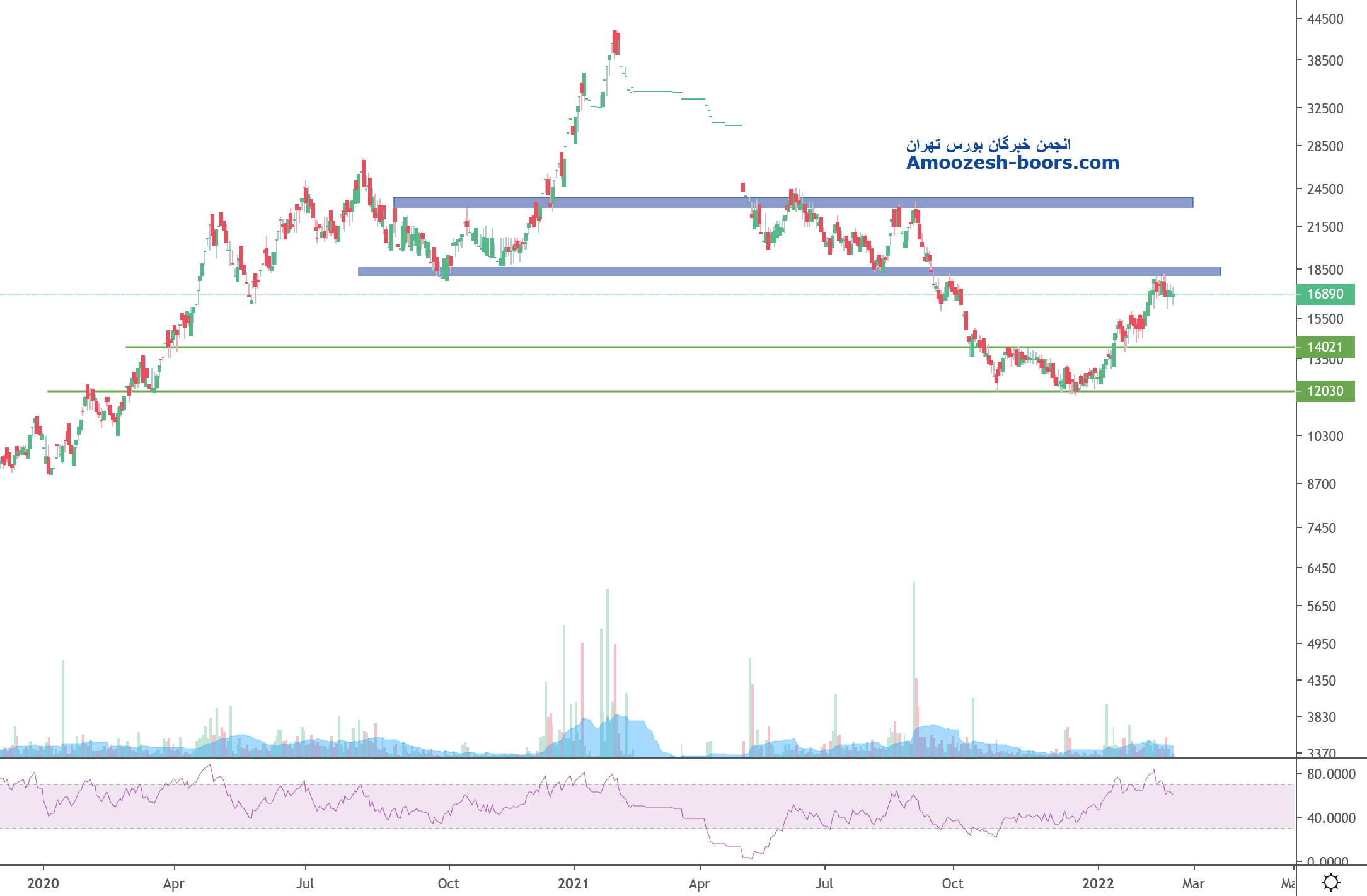 قیمت با رسیدن به محدوده مقاومتی خود و کاهش مومنتوم خرید تمایل به اصلاح نشان داده است در صورت ادامه فشار فشار فروش نزول قیمت تا حمایت استاتیک و روانی عدد رند 14000 ریال محتمل خواهد بود و در صورت شکستن محدوده مقاومتی خود و تثبیت قیمت بالای این محدوده تارگت سهم 22000 ریال خواهد بود.