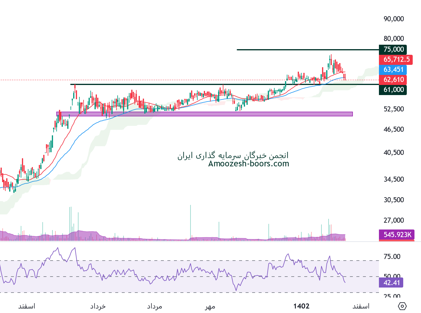 بررسی تحلیل تکنیکال سهم پسهند نشان میدهد که قیمت در محدوده حمایتی 61000 ریال قرار دارد، در صورت تثبیت و بیس سازی قیمت در این منطقه و ایجاد نشانه های برگشت مثل کندل های قوی صعودی، میتوان اولین تارگت پسهند را 75000 ریال در نظر گرفت، همچنین در صورت شدت گرفتن فشار فروش در این محدوده حمایتی و از دست رفتن حمایت نماد پسهند ، حمایت بعدی سهم پسهند 50000 ریال ارزیابی میگردد.