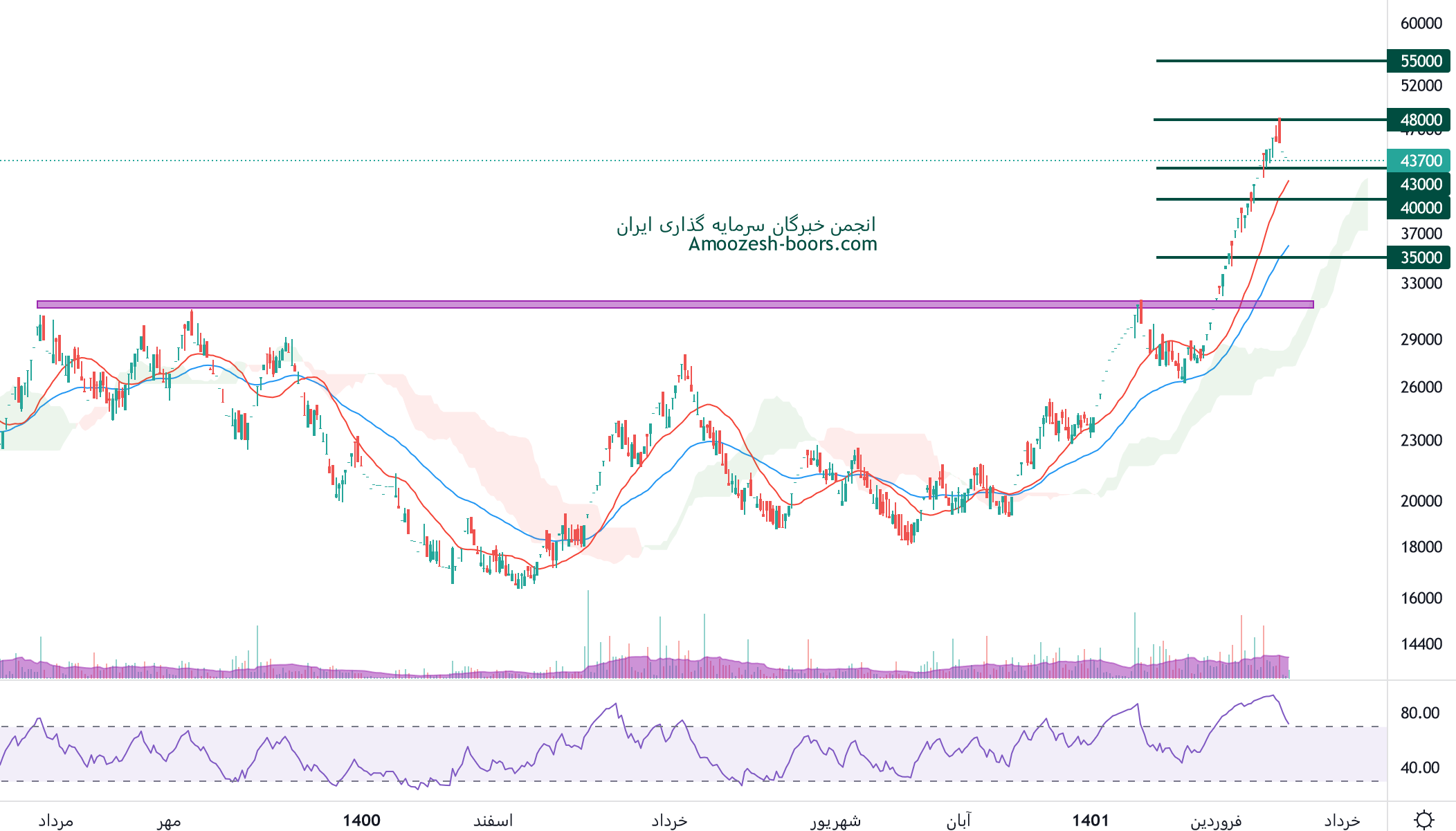 نماد پلوله در حال حاضر مابین محدوده های حمایتی 43000 ریال و مقاومتی 48000 ریال قرار دارد و در حال اصلاح تکمیل خود میباشد، در صورت از دست رفتن سطح حمایتی ذکر شده به سهامداران محترم این نماد پیشنهاد به جایگزینی این سهم میگردد، همچنین در صورت تثبیت قیمت، مقاومت بعدی سهم 55000 ریال ارزیابی میگردد.