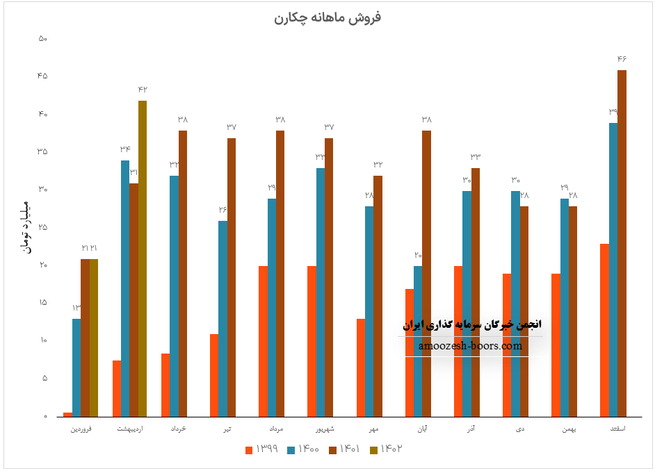فروش نماد چکارن نسبت به ماه گذشته افت 1 درصدی داشته و به رقم 49.6 میلیارد تومان رسیده است، عملکرد سهم چکارن طی دوره 1 ماهه نسبت به متوسط ماهانه و مدت مشابه رشد 32 درصدی داشته است، انواع کارتن ورق به عنوان محصول پر فروش سهم چکارن افت 1 درصدی نرخ فروش را تجربه کرده و در مقدار فروش با ثبات بوده است، مجموع عملکرد چکارن از ابتدای سال مالی افزایش 27 درصدی داشته و طی این مدت 40% از کل درآمد سال گذشته محقق گردیده است.