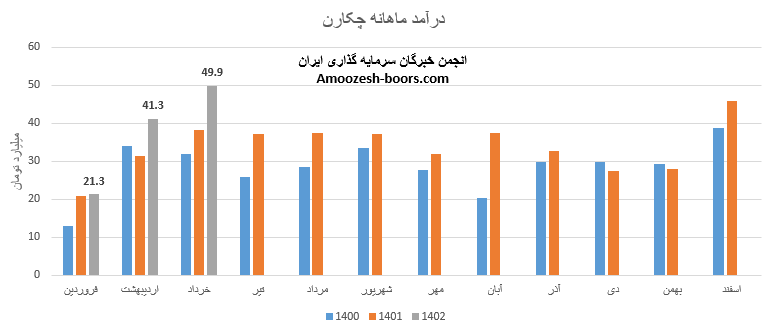 نماد چکارن در عملکرد ماهانه با افت چشمگیر درآمد همراه بوده است و فروش 24 میلیارد تومانی را در مرداد ماه سال 1402 اعلام نموده است، این رقم تغییرات زیر را تجربه نموده است: