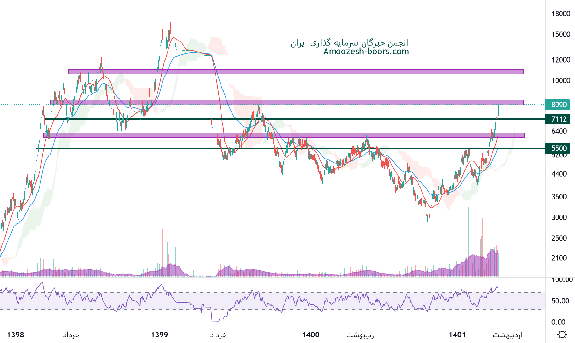 نماد کاذر با رشد خوبی که داسته در حال حاضر به محدوده مقاومتی 8000 ریال رسیده، در صورت عبور از این محدوده مقاومتی، مقاومت بعدی محدوده 11000 ریال در نظر گرفته خواهد شد، همچنین در صورت بروز نشانه های اصلاحی برای مثال کندل قوی برگشتی، چارت پر ریسک ارزیابی خواهد شد و اولین حمایت سهم کاذر 7000 ریال خواهد بود.