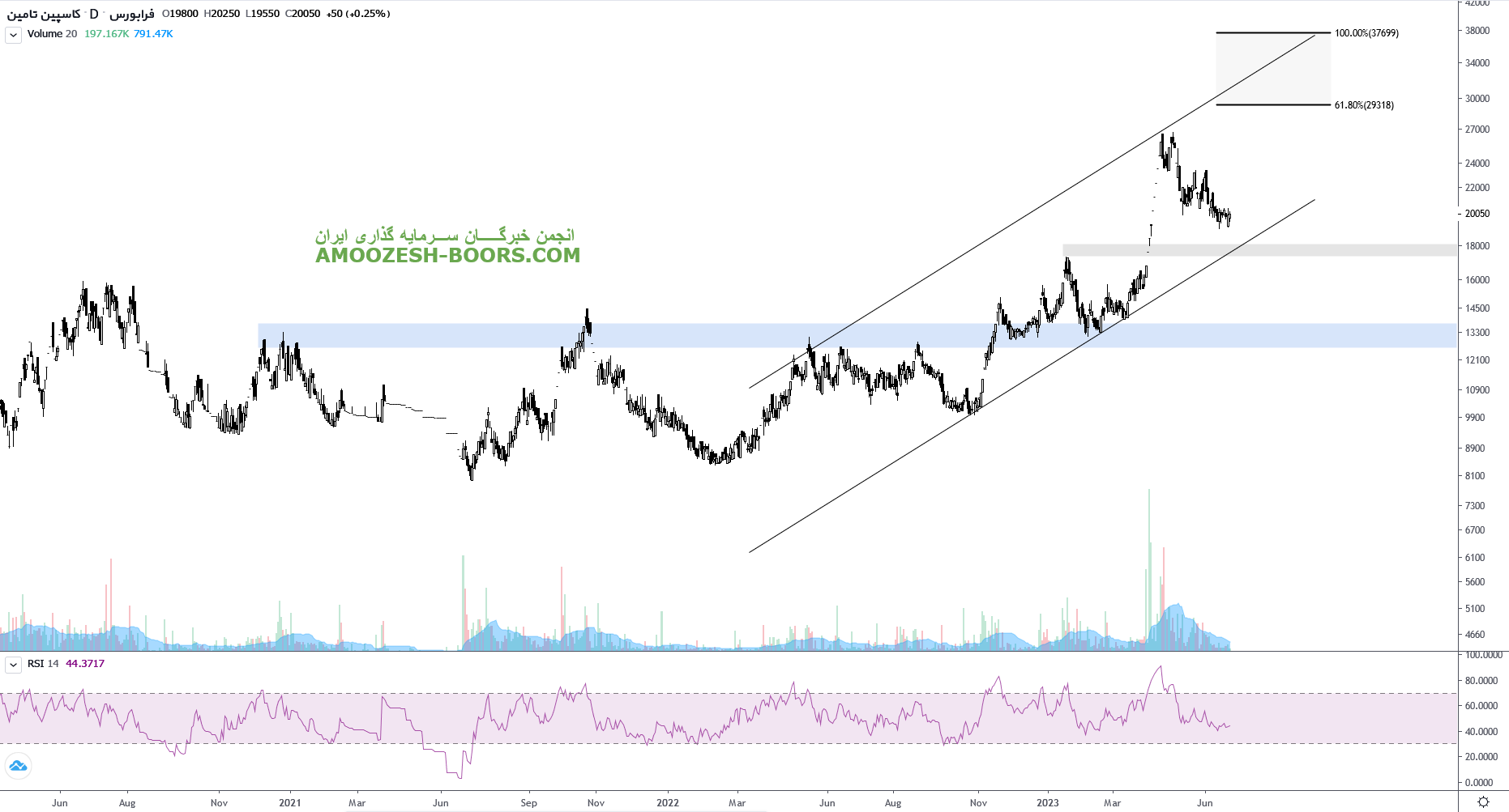 قیمت سهم کاسپین به ناحیه حمایتی کف کانال صعودی بلند مدت خود برخورد کرده که در صورت ایجاد تقاضا در کلیت بازار و همچنین سهم کاسپین حرکت قیمت تا مقاومت ناحیه ۲۳۰۰ و در صورت شکست مقاومت سقف کانال صعودی یعنی ۳۵۰۰ تومان در میان مدت ادامه خواهد داشت. اما در صورت عدم ایجاد تقاضا در کلیت بازار و از دست رفتن حمایت کف کانال حمایت بعدی سهم کاسپین ناحیه ۱۵۰۰ تومان در نظر گرفته خواهد شد.