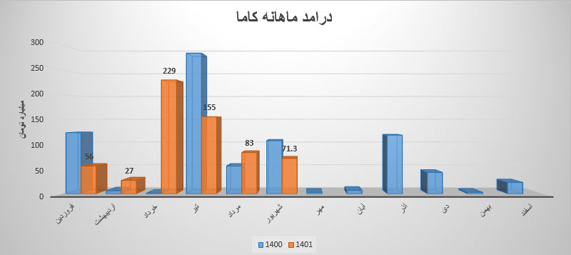 کاما در آذر ماه حدود بیش از 11000 تن از محصولات خود را به فروش رسانده که این میزان در مقایسه با حجم فروش ماه گذشته خود حدود 31% کاهش پیدا کرده است.