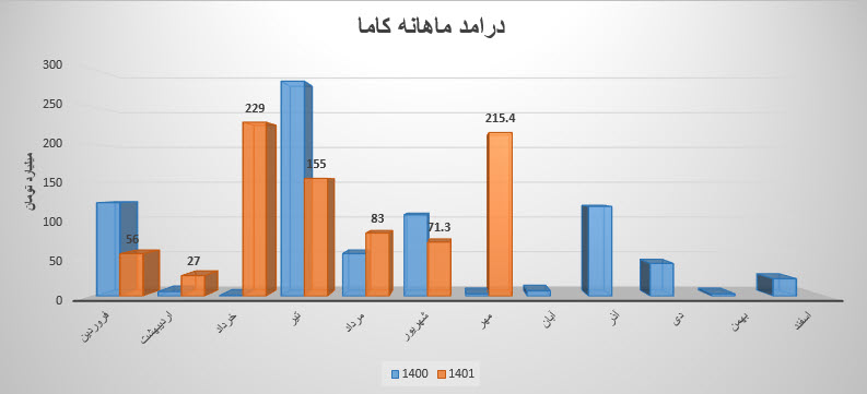 شرکت کاما (باما) در آبان ماه ۱۴۰1 حدود مبلغ 63 میلیارد تومان درآمد داشته که این میزان در مقایسه با ماه گذشته 71% کاهش و همچنین در مقایسه با مدت مشابه سال گذشته 800% افزایش درآمد پیدا کرده است.