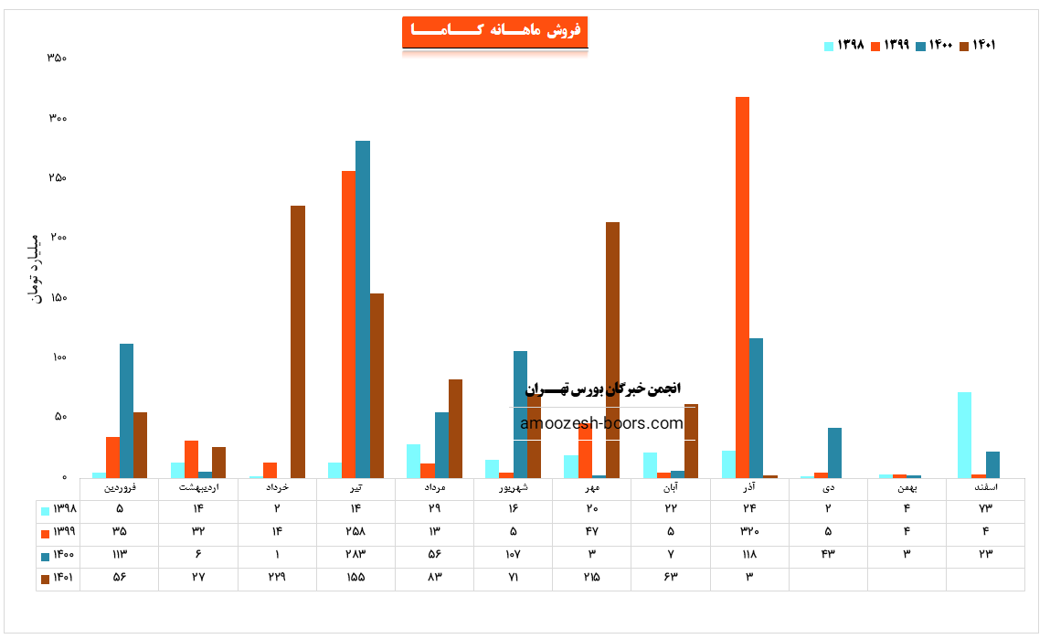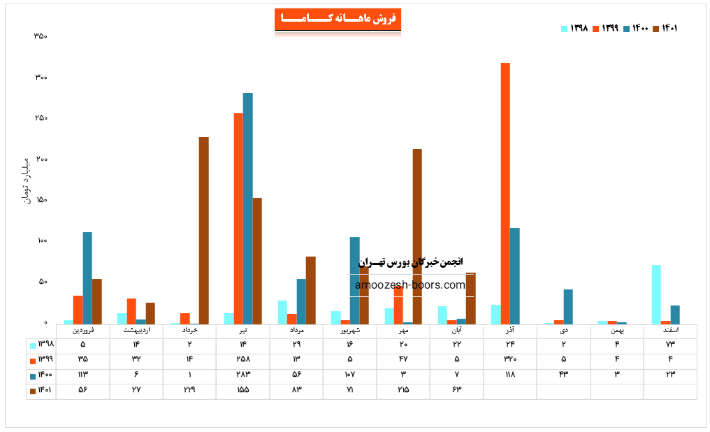 کاما در آبان ماه حدود بیش از 16000 تن از محصولات خود را به فروش رسانده که این میزان در مقایسه با حجم فروش ماه گذشته خود حدود 41% کاهش پیدا کرده است.