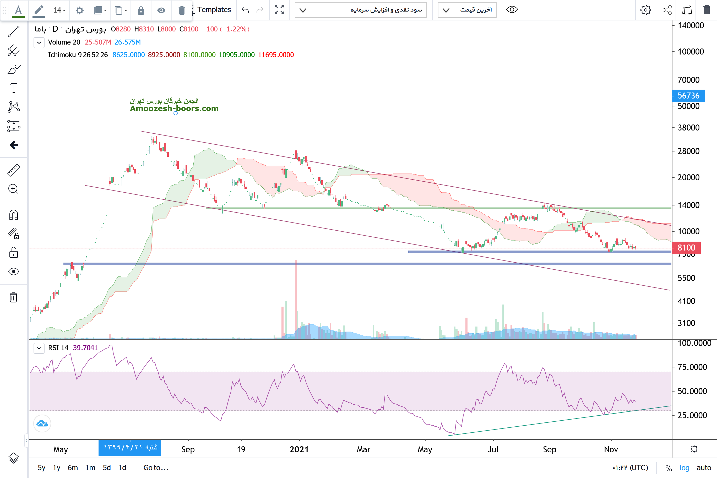 قیمت سهم در محدوده 7500 در چارت بدون تعدیل یک محدوده حمایت قوی استاتیک میباشد و در چارت تعدیل شده نیز حمایت دره قبلی رو دارا میباشد و با توجه به واگرایی مثبت آر اس آی تثبیت قیمت درین ناحیه محتما میباشد . همچنین در سناریو بدبینانه در صورت از بین رفتن این منطقه حد ضرر فعال خواهد شد
