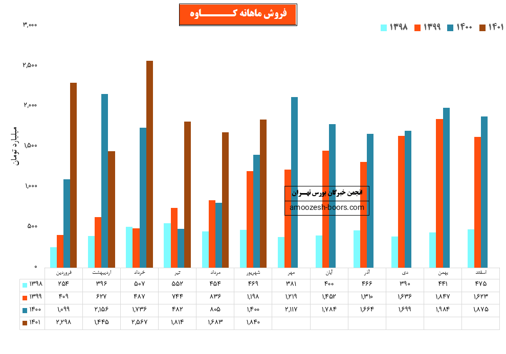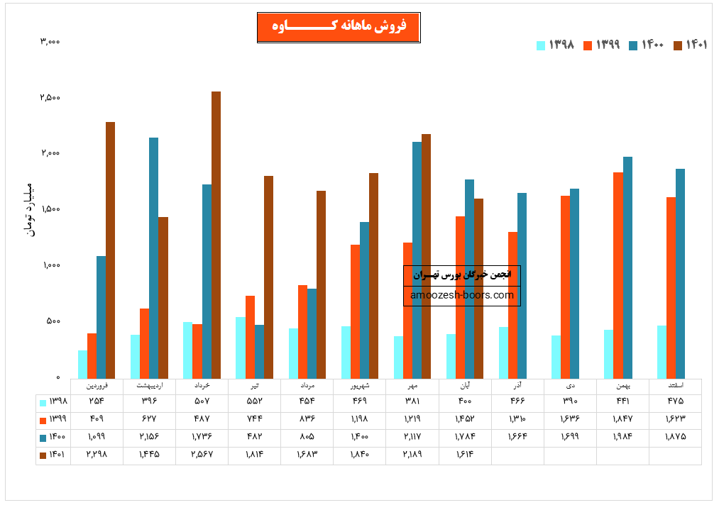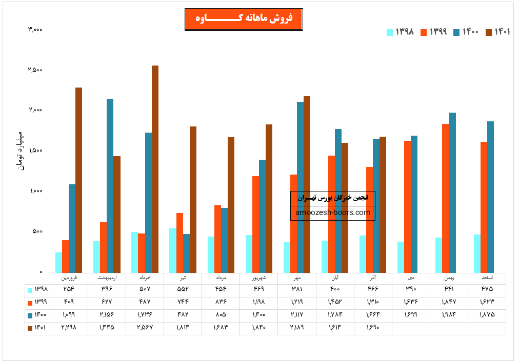 نماد کاوه در آبان ماه حدود 42 هزار تن فروش داخلی و همچنین حدود 81 هزار تن فروش صادراتی داشته است که در مقایسه با حجم فروش ماه گذشته حدود 18% کاهش در فروش داخلی و حدود 33% کاهش فروش صادراتی داشته است.
