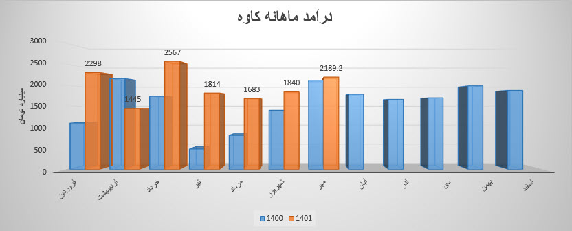 نماد کاوه (شرکت فولاد کاوه جنوب کیش) در آبان ماه سال ۱۴۰۱ حدود مبلغ 1614 میلیارد تومان درآمد داشته که این میزان در مقایسه با ماه گذشته 26% و همچنین در مقایسه با مدت مشابه سال گذشته 10% کاهش درآمد داشته است.