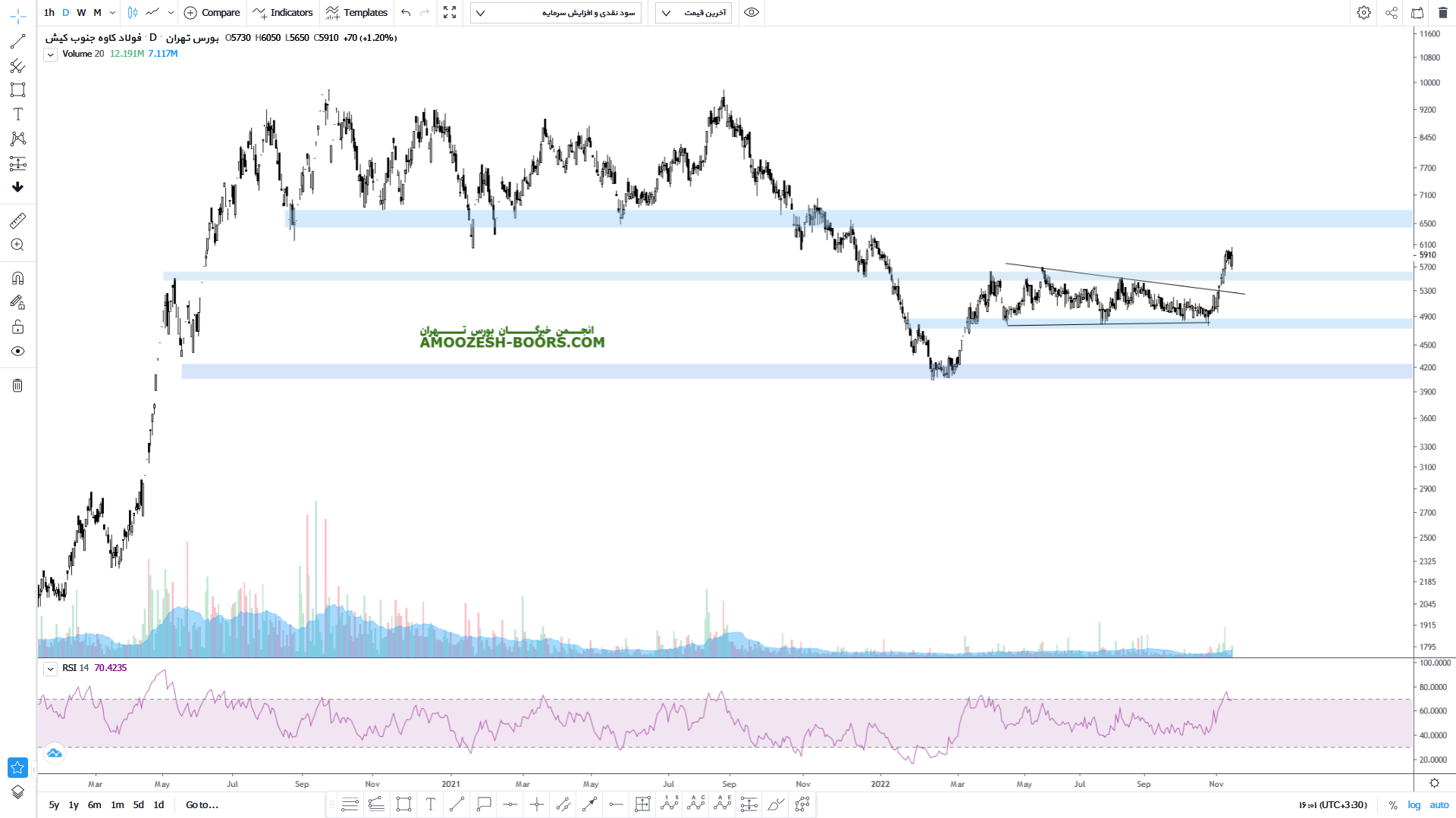 قیمت سهم کاوه پس از خروج از الگوی اصلاحی فشرده شده و با شکست مقاومت مهم ناحیه ۵۵۰ تومان اکنون در حال پولبک به این ناحیه شکسته شده می باشد که می تواند در صورت تایید پولبک رشد خود را تا مقاومت ناحیه ۶۷۰ تومان نیز ادامه دهد اما در صورت برگشت مجدد و از دست رفتن ناحیه حمایتی ۵۵۰ تومان قیمت می تواند اصلاح خود را تا کف مهم ۴۸۰ تومان نیز ادامه دهد.