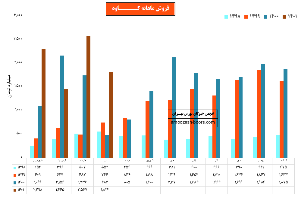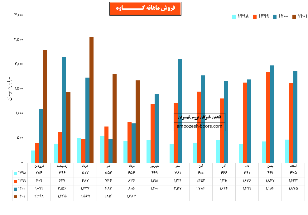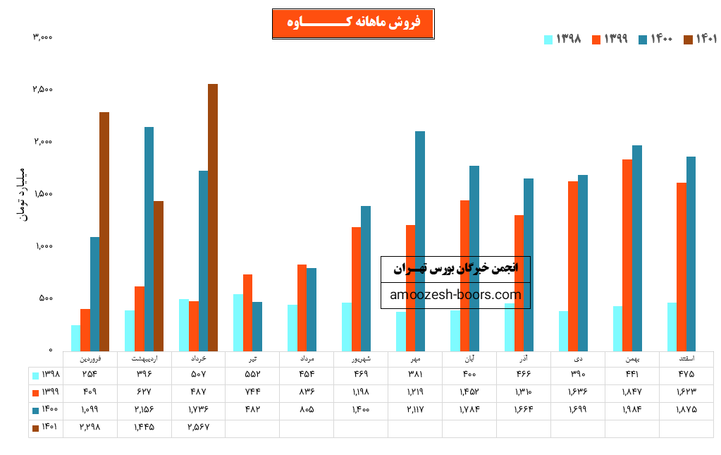 نماد کاوه در مرداد ماه حدود 53 هزار تن فروش داخلی و همچنین حدود 69 هزار تن فروش صادراتی داشته است که در مقایسه با حجم فروش ماه گذشته حدود 1% کاهش در فروش داخلی و حدود 13% کاهش فروش صادراتی داشته است.