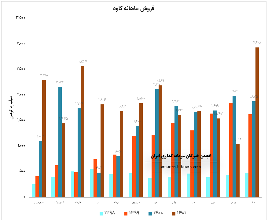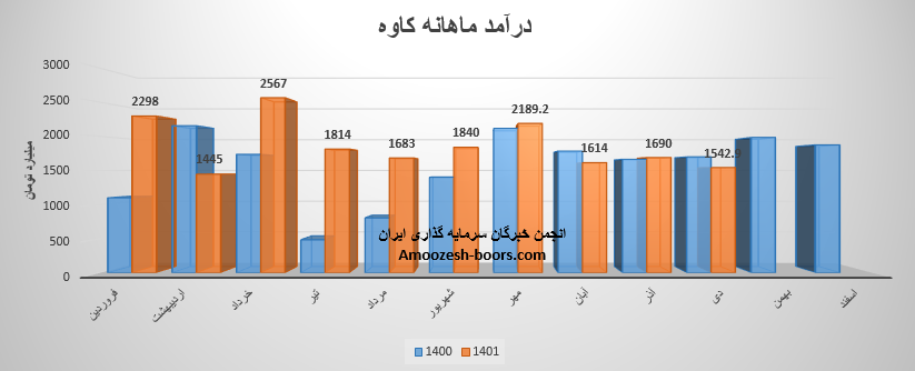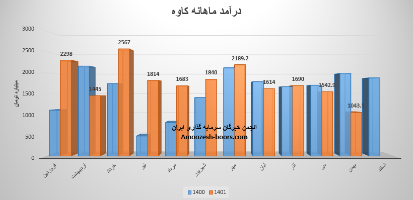 نماد کاوه که در زمستان با افت مقدار فروش مواجه است در بهمن ماه درآمد 1043.5 میلیارد تومانی را گزارش نموده است، این رقم در مقایسه با ماه گذشته افت 32 درصدی، نسبت به متوسط ماهانه افت 44 درصدی و نسبت به مدت مشابه افت 47 درصدی را تجربه نموده است.