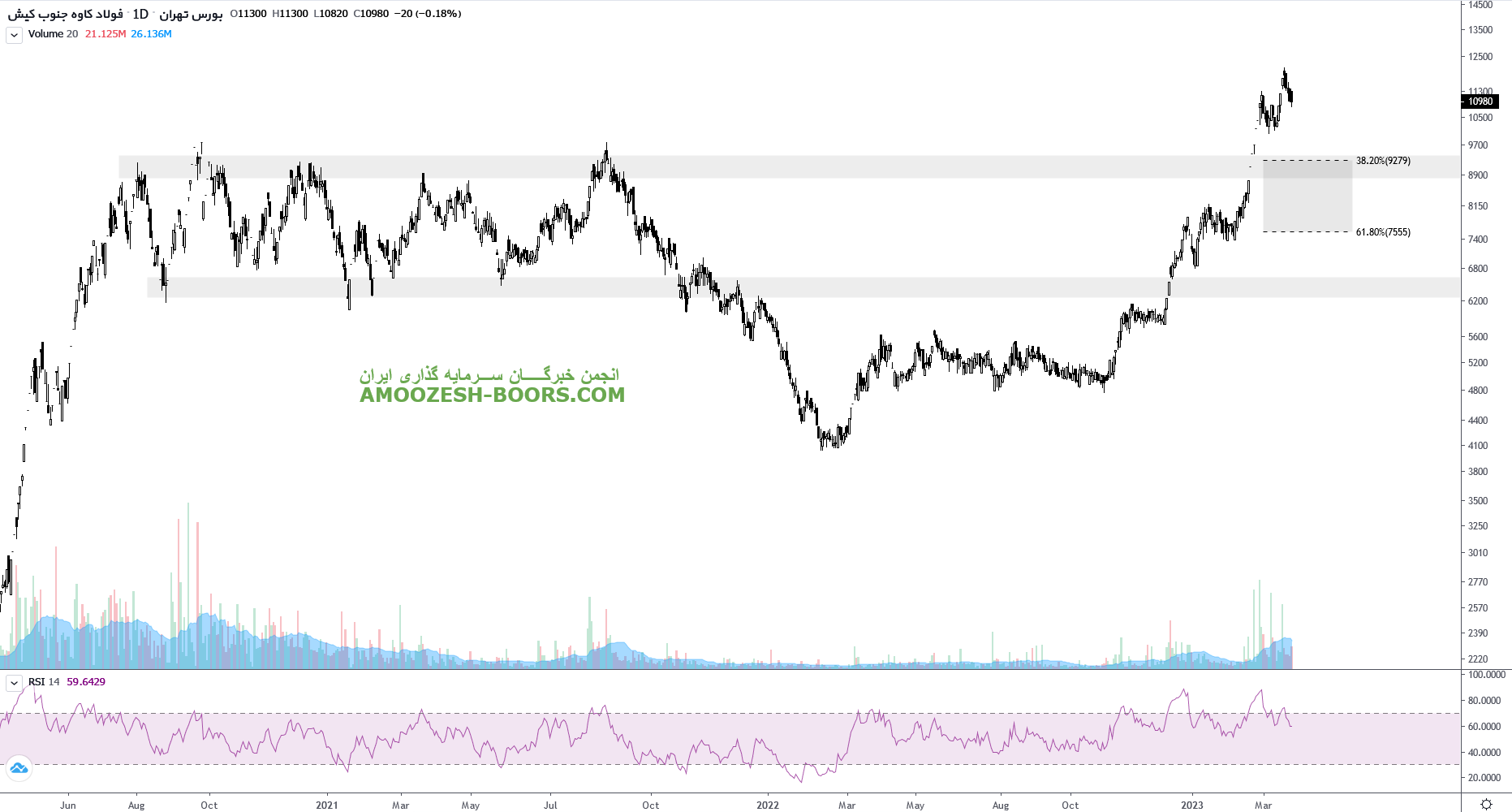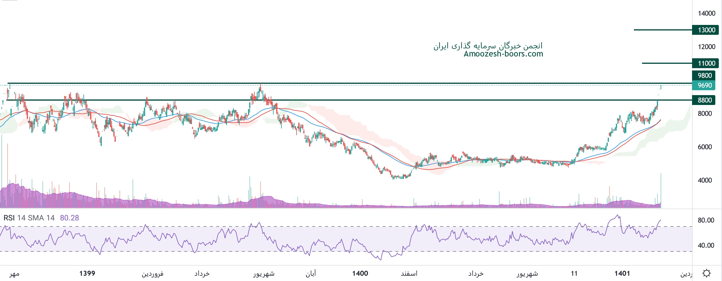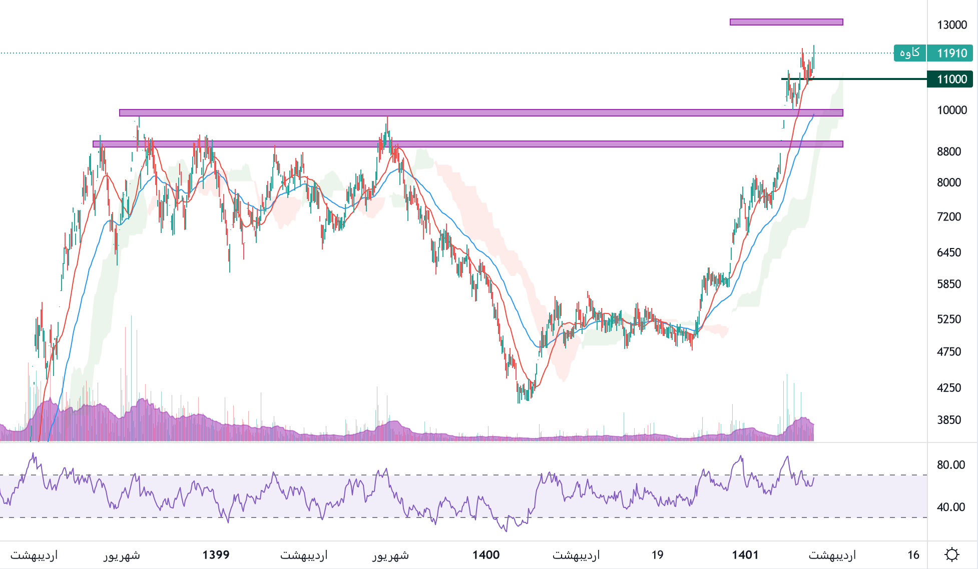 همانطور که نمودار کاوه ملاحظه مبفرمایید ،نماد کاوه که با لگ صعودی پر قدرتی همراه بوده است مقاومت های مهم کاوه 12000 و 13500 ریال را در نظر گرفته میشود، مجددا واکنش و بررسی قیمت در این ناحیه الزامی میباشد چرا که استراحت قیمتی در ناحیه محتمل میباشد.به سهامداران کاوه پیشنهاد میشود حد ضرر خود را بهمراه قیمت بالا برده و تریلینگ استاپ انجام دهند.