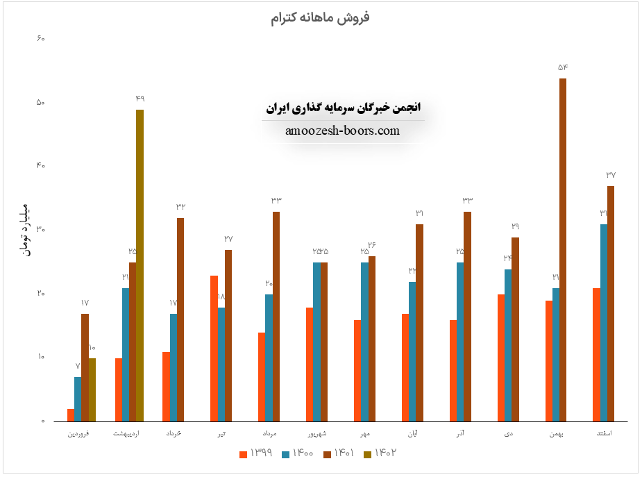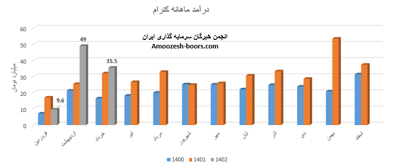 نماد کترام (شرکت تولیدی کاشی تکسرام) در اردیبهشت ماه 1402 حدود مبلغ 49 میلیارد تومان درآمد داشته که این میزان در مقایسه با ماه گذشته 390% و همچنین در مقایسه با مدت مشابه سال گذشته 96% رشد پیدا کرده است.