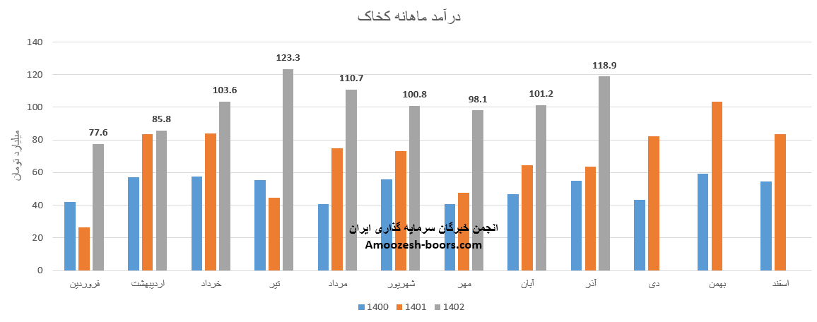درآمد آبان ماه سال 1402 سهم کخاک 101.2 میلیارد تومان بوده است که در مقایسه با ماه گذشته 3% رشد داشته است.