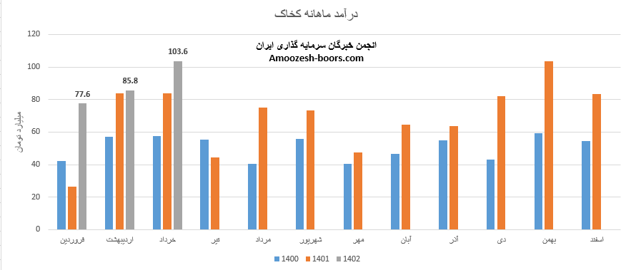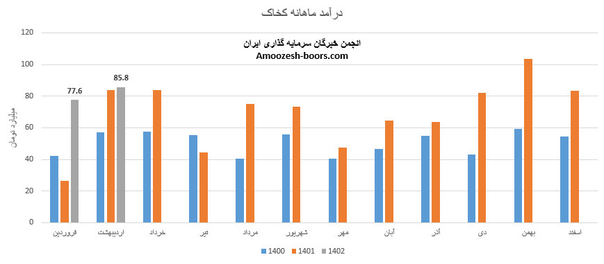 نماد کخاک (شرکت صنایع خاک چینی ایران) در تیر ماه 1402 حدود مبلغ 123 میلیارد تومان درآمد داشته که این میزان در مقایسه با ماه گذشته 18% و همچنین در مقایسه با مدت مشابه سال گذشته 173% رشد پیدا کرده است.