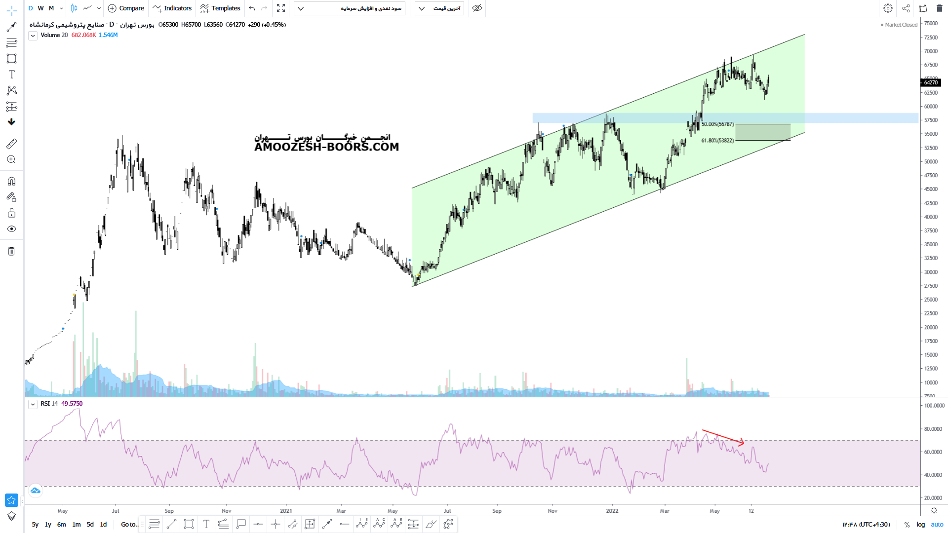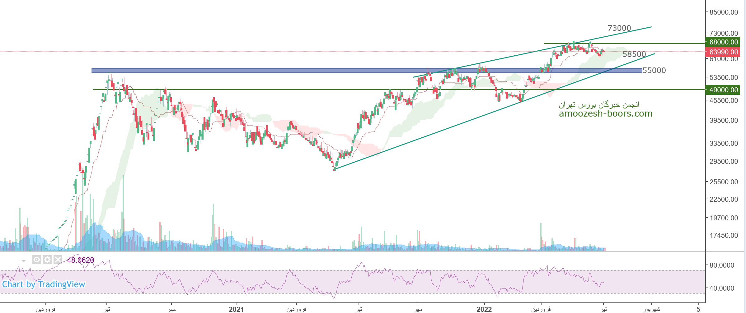 قیمت پس از تست چند باره سقف مقاومتی کانال صعودی خود با ایجاد یک واگرایی منفی و کاهش قدرت خریداران در برخورد های دوم و سوم وارد فاز اصلاحی شده و اکنون حمایت محدوده 6000 تومان را پیش روی خود دارد که می تواند پس از برخورد به آن مجدداً نوسانی رو به بالا تا سقف کانال صعودی خود تجربه کند. عدم حمایت در این محدوده میتواند خود را تا کف کانال صعودی خود ادامه دهد.