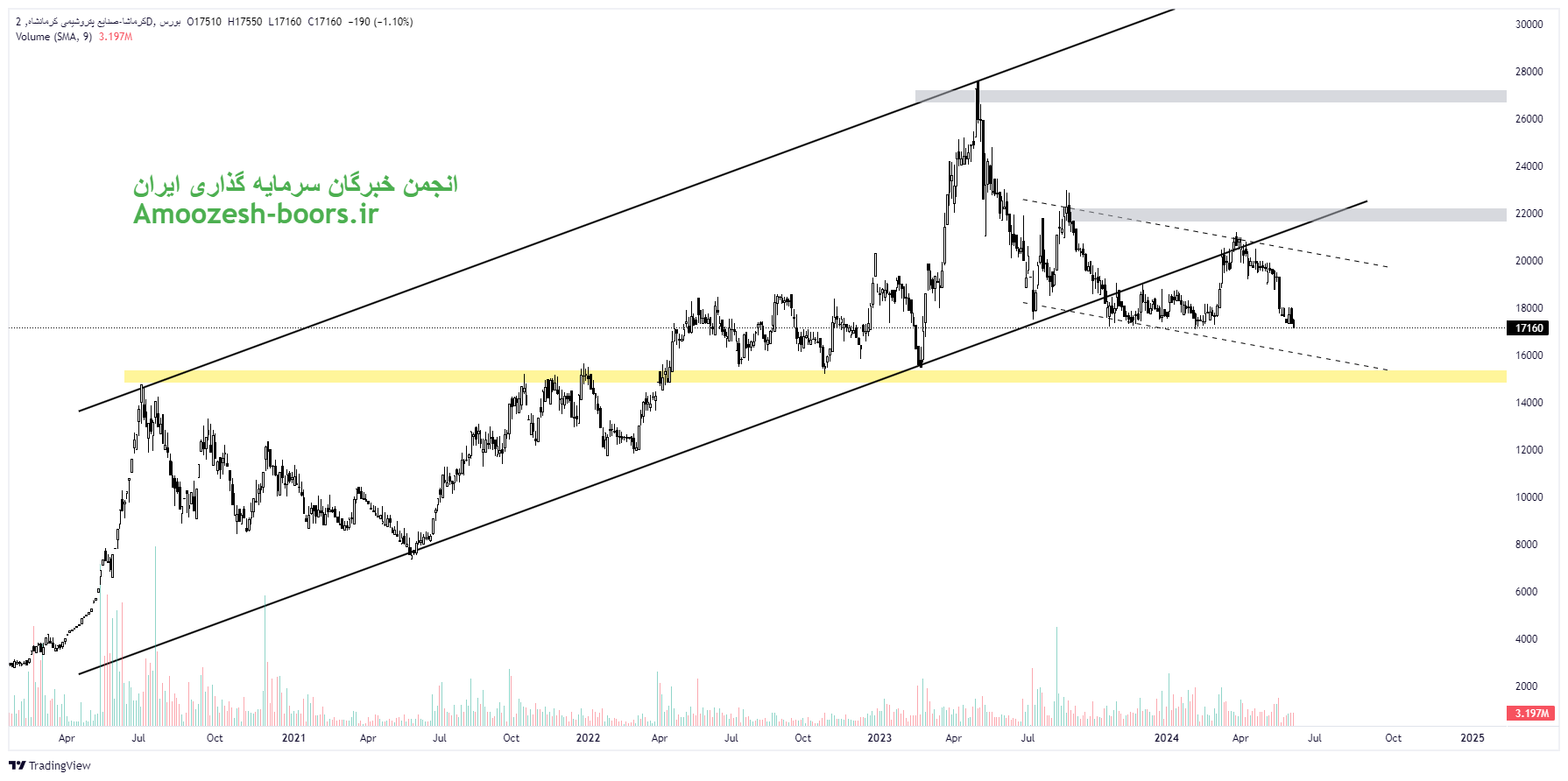 سهم کرماشا در قالب یک کانال نزولی در حال اصلاح میباشد لذا در صورت ایجاد تقاضا در کلیت بازار، سهم کرماشا میتواند از نزدیکترین ناحیه حمایتی خود یعنی ناحیه ۱۵ هزار ریال مورد تقاضا قرار گرفته و لذا در همین راستا حرکت صعودی را تا ناحیه مقاومتی سقف کانال نزولی یعنی ناحیه ۲۰ هزار ریال ادامه دهد. در صورت عبور از سقف کانال نزولی، روند صعودی سهم تثبیت شده رسیدن به مقاومتهای 22 هزار ریال و ۲۷ هزار ریال در میان مدت دور از انتظار نخواهد بود.