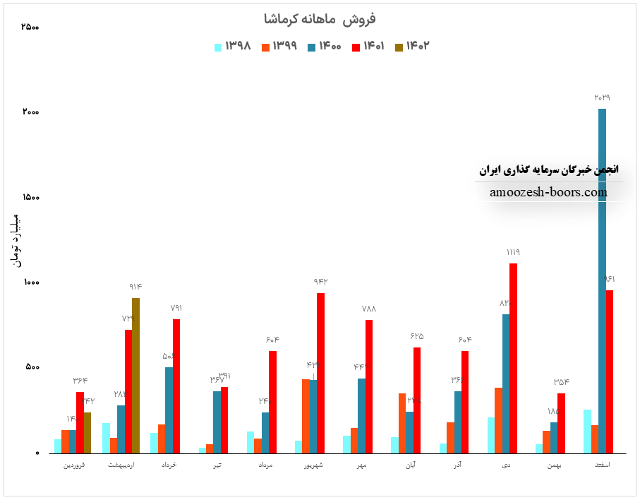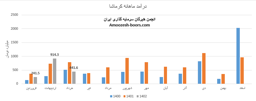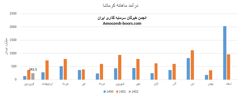 نماد کرماشا طی دوره 1 ماهه به فروش 441.6 میلیارد تومان دست یافته که 66% از این درآمد از طریق فروش صادراتی و مابقی به فروش داخلی رسیده است، درآمد ماهانه سهم کرماشا نسبت به ماه قبل 52%، نسبت به متوسط ماهانه 24% و نسبت به مدت مشابه 44% افت داشته است، سهم کرماشا اوره خود را با نرخ 346 دلار صادر نموده که 8% از نرخ جهانی بالاتر است، مجموع عملکرد 3 ماهه کرماشا نسبت به مدت مشابه افت 15 درصدی داشته و طی این مدت فقط 9% از کل درامد سال قبلی تحقق یافته است.