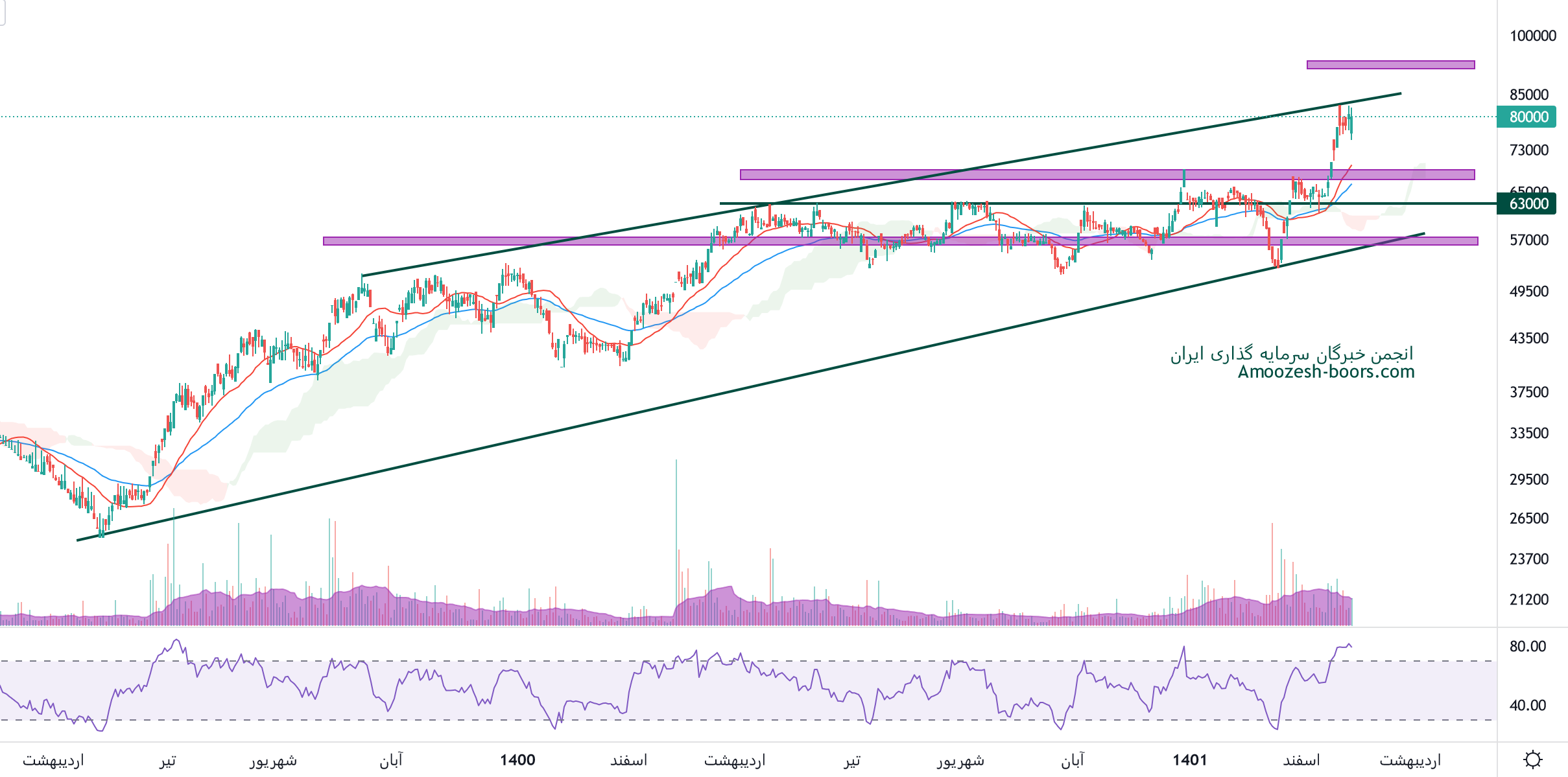 نماد کرماشا به مقاومت خط داینامیک خود در محدوده قیمتی 82500 ریال واکنش منفی نشان داده، در صورت ادامه دار شدن اصلاح، حمایت های سهم کرماشا به ترتیب 69000 و 63000 ریال ارزیابی خواهد شد، همچنین در صورت عبور قیمت از این محدوده، حرکت سهم تا محدوده 93000 ریال محتمل خواهد بود.