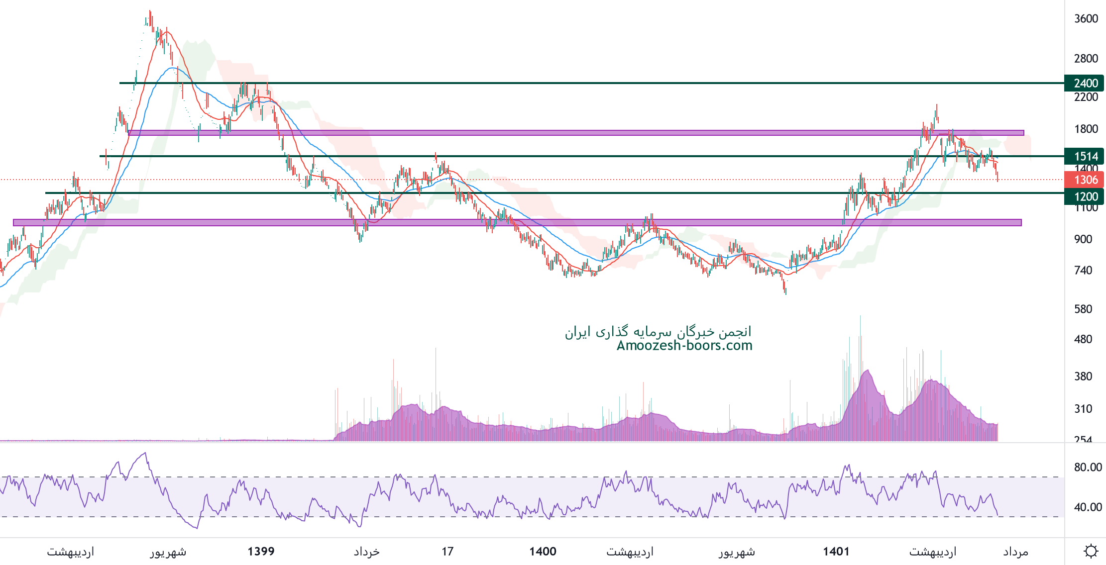 نماد کرمان در حال حاضر در فاز اصلاحی میباشد، 1200 ریال اولین حمایت پیش روی این نماد خواهد بود و حمایت بعدی 1000 ریال ارزیابی میگردد، همچنین در صورت تثبیت قیمت سهم کرمان، مقاومت های سهم یه ترتیب 1500 و 1700 ریال خواهند بود، در حال حاضر هیچ گونه سیگنال ورود و خروجی صادر نشده است.