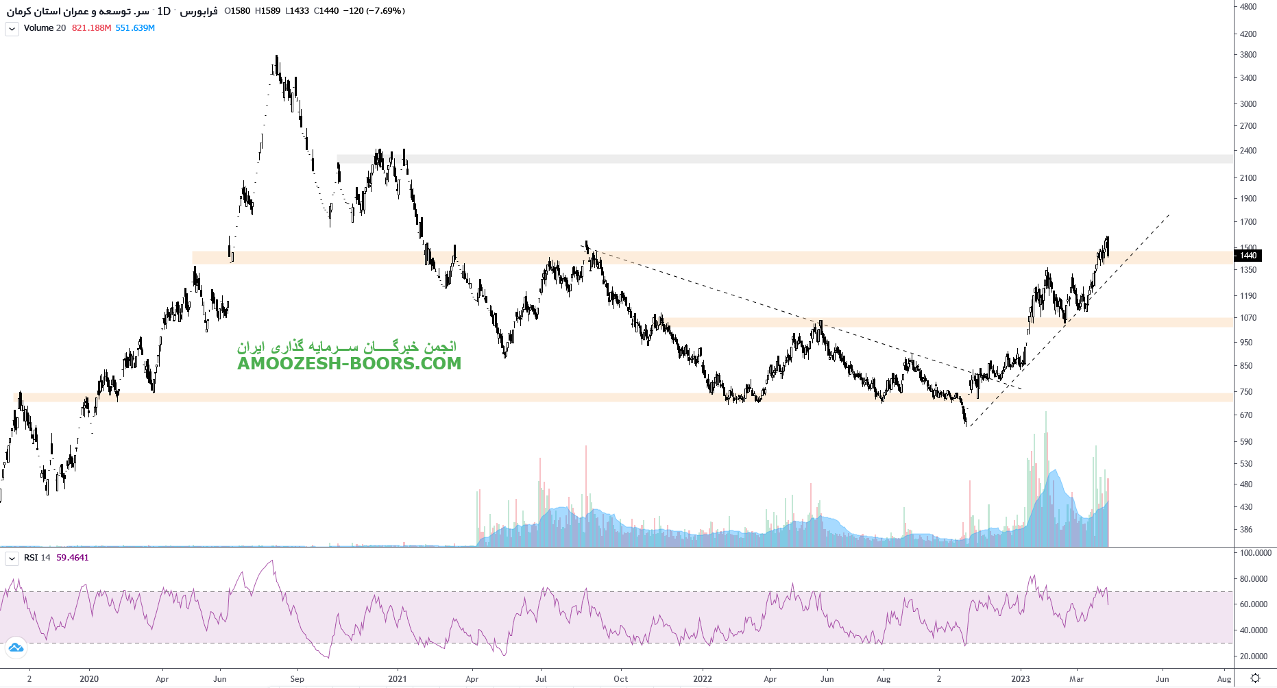 قیمت سهم کرمان بر روی مقاومت مهم ناحیه ۱۴۵ تومان قرار گرفته است که در صورت تثبیت شکست، مقاومت بعدی سهم کرمان ناحیه ۲۳۰ تومان تعیین خواهد شد. اما در صورت برگشت مجدد به زیر مقاومت و همچنین شکست خط روند صعودی سهم کرمان، اولین حمایت مهم سهم کرمان ناحیه 100 تومان در نظر گرفته خواهد شد.