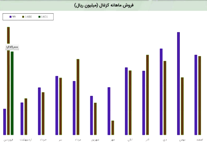 کزغال در اردیبهشت فروش عالی 2.467 میلیارد ریالی را ثبت کرده است درآمد شرکت در این دوره نسبت به ماه قبل 46% افزایش و نسبت به میانگین ماه های قبل 46% افزایش داشته است.