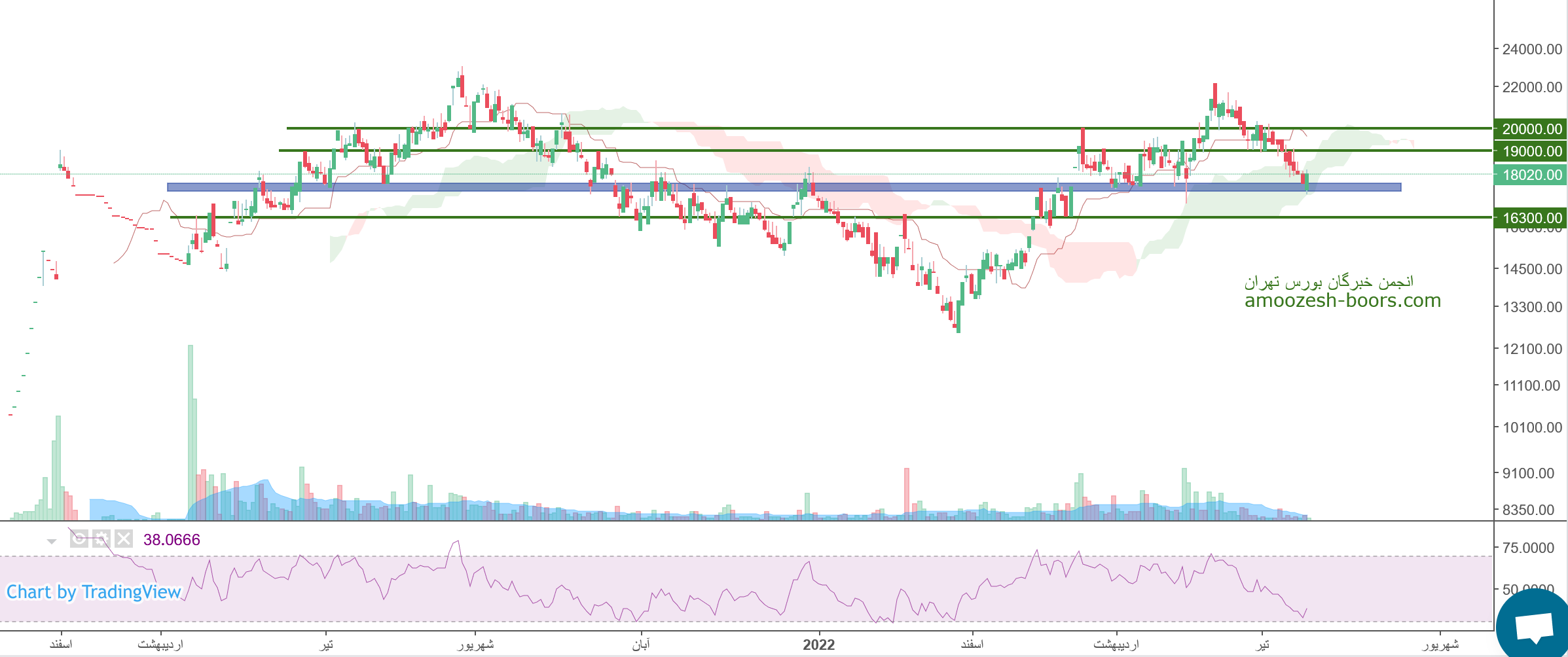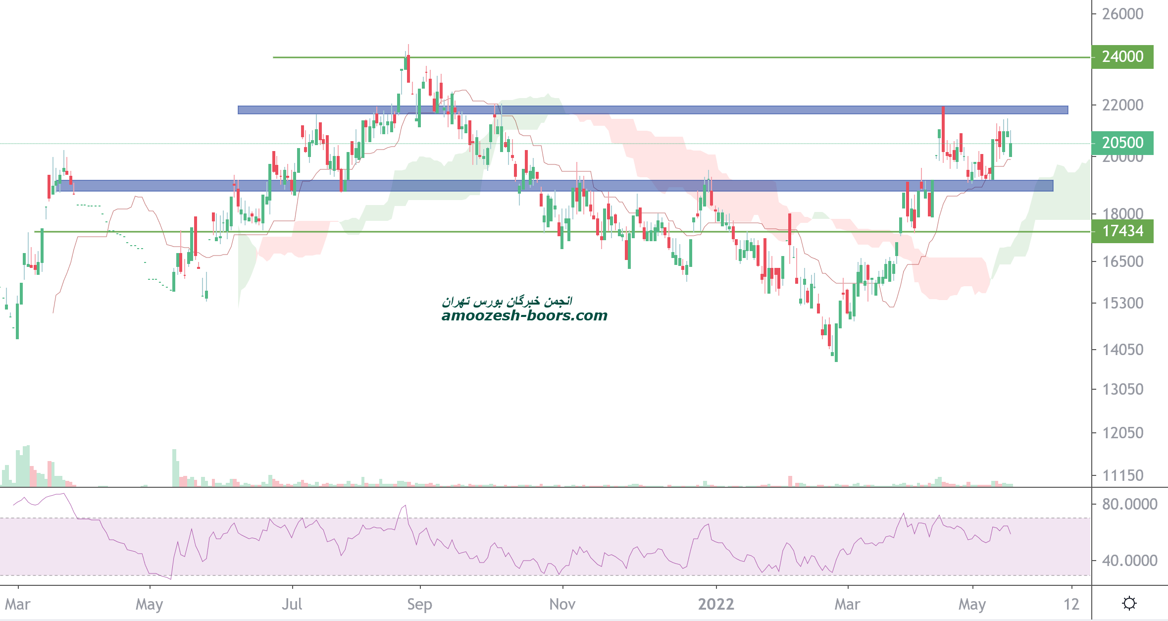 قیمت در حال حاضردر حال نوسان بین محدوده حمایت و مقاومتی میباشد در صورت ادامه دار شدن حجم تقاضا و شکسته شدن محدوده حمایتی و تثبیت بالای آن حرکت قیمت تا محدوده قیمتی 24000 ریال محتمل میباشد و در صورت از دست رفتن کف حمایتی اصلاح قیمت تا محدوده قیمتی 17500 ریال دور از ذهن نخواهد بود.
