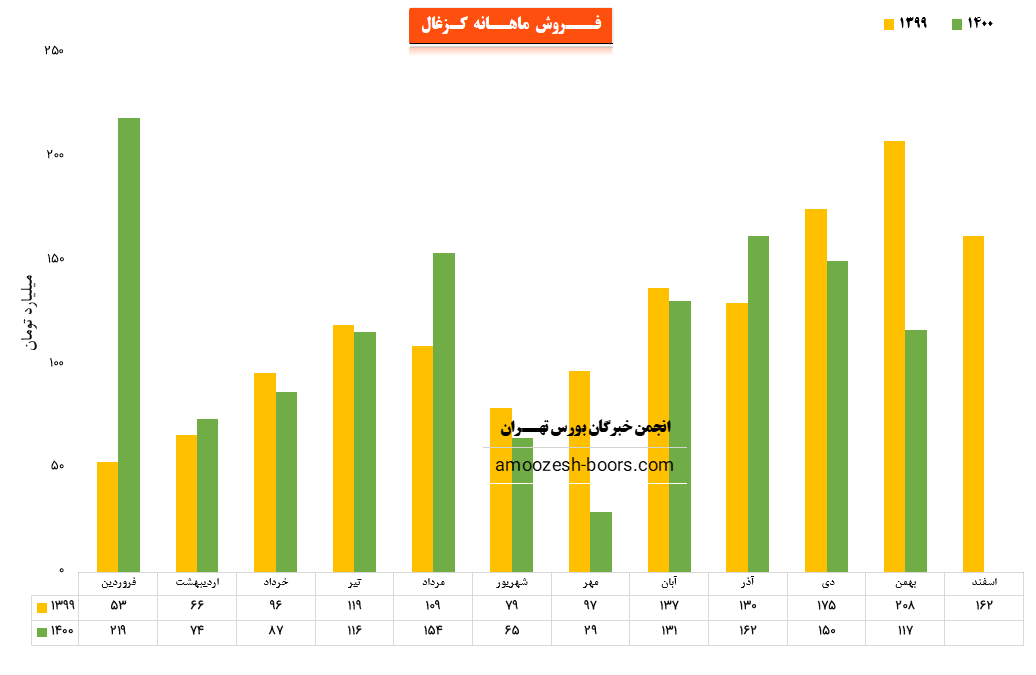 کزغال در دی ماه بیش از 45 هزار تن از کنستانتره زغال سنگ فروخته و از این مسیر 1.497 میلیارد ریال درآمد کسب کرده است. این فروش در قیاس با متوسط فروش 3 ماهه پاییز 39 درصد بهتر است. لازم به ذکر است این مقدار در مقایسه با فروش آذر ماه با کاهش 8 درصد همراه بوده است شرکت در دی ماه 45 هزار تن محصول فروخته که نسبت به ماه گذشته 28% افت داشته است البته نرخ فروش در این ماه نیز مقداری کاهشی بوده است نرخ فروش کنسانتره ذغالسنگ در دی ماه، حدود 3500 تومان به ازای هر کیلوگرم بوده که نسبت به ماه گذشته اندکی افت داشته است.