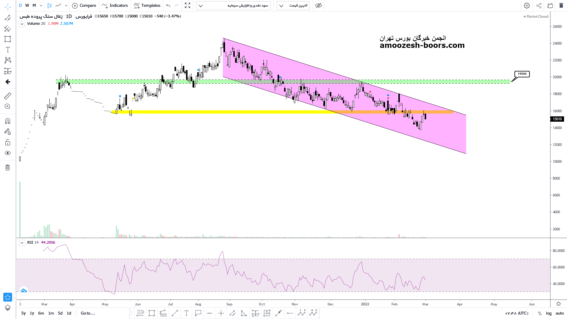 قیمت پس از اصلاح ۶ ماهه با شکست محدوده حمایتی ۱۶۰۰ تومان اکنون در حال انجام پولبک به این محدوده از دست رفته می باشد که در صورت تایید پول میتواند ریزش خود را تا محدوده کف کانال یعنی محدوده ۱۲۰۰ تومان ادامه دهد اما در صورت برگشت مجدد محدوده مقاومتی سقف کانال را پیش روی خود دارد که در صورت عبور از آن میتواند تا محدوده ۲۰۰۰ تومان صعود خود را ادامه دهد.