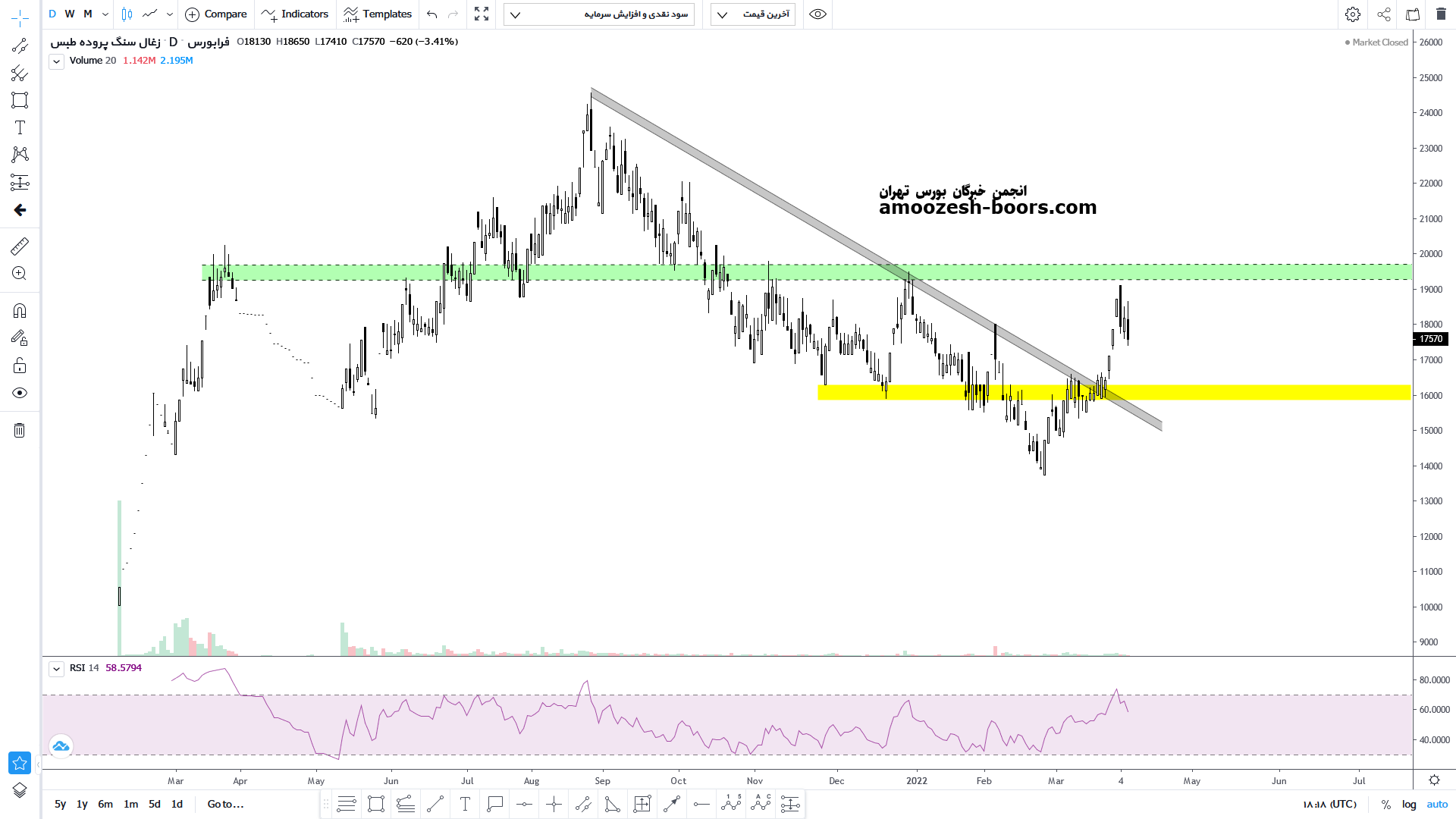 قیمت پس از شکست خط روند نزولی خود تا محدوده مقاومتی ۲۰۰۰ تومان رشد خود را ادامه داده و با بروز واکنش منفی به این محدوده مقاومتی اصلاح کوتاه مدتی را آغاز کرده است. محدوده حمایتی ۱۶۰۰ تومان اولین محدوده حمایتی پیشروی قیمت می باشد که می تواند با تشکیل یک الگوی قیمتی خود را به این محدوده حمایتی رسانده و سپس با نشانههای حمایت رشد خود ادامه دهد.