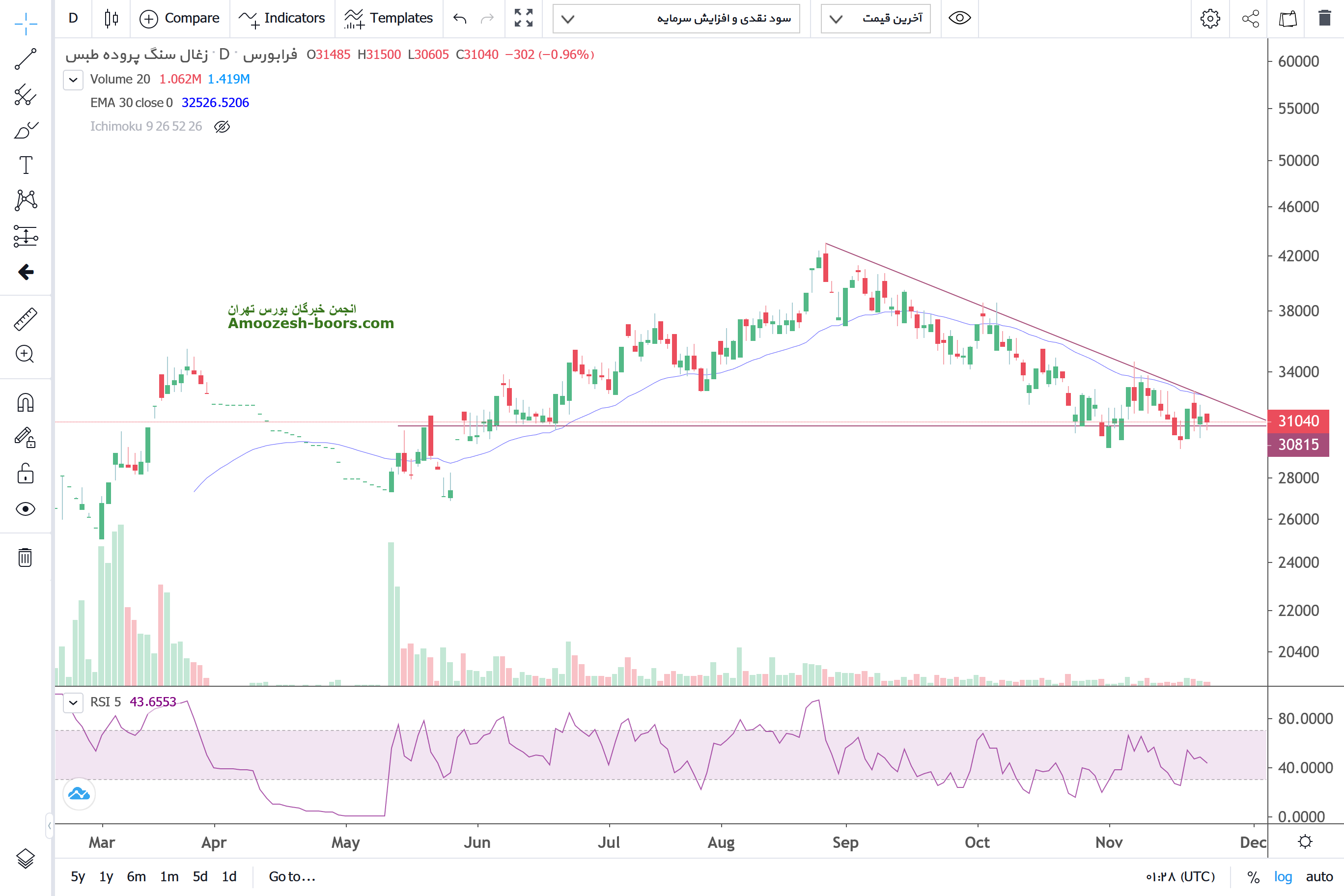 قیمت در هفته اخیر با ایجاد واگرایی مثبت در محدوده حمایتی واکنش مثبت نشان داده است و اولین مقاومت 33000 جهت اصلاح سبد در نظر گرفته میشود وسهامدارن در نظر داشته باشیند تا زنمانیکه قیمت بالای مقاومت داینامیک نزولی یا مووینگ میان مدت تثبیت نشده ایجاد روند صعودی محقق نخواهد شد همچنین در صورت ایجاد فشار فروش و از بین رقتن این حمایت حد ضرر فعال خواهد شد .