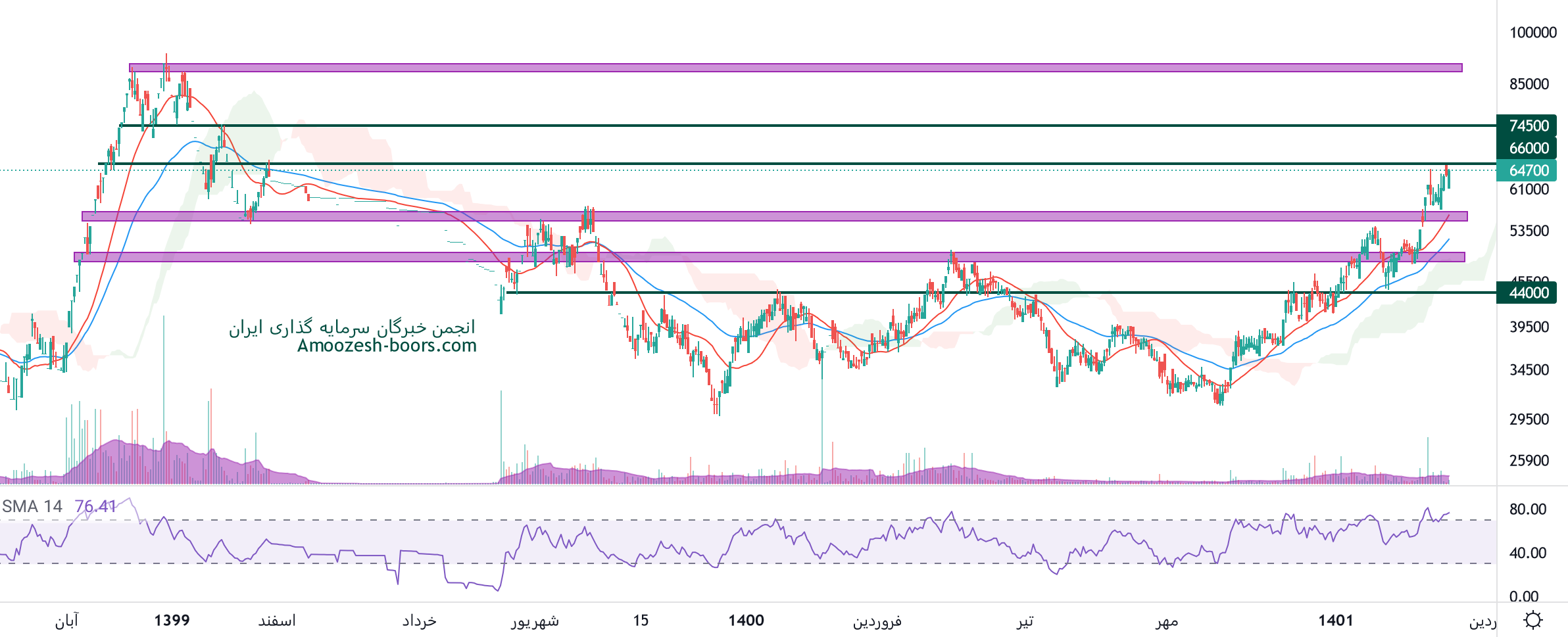 نماد کساوه درگیر مقاومت 66000 ریال میباشد، در حال حاضر ریسک ورود برای این نماد بالا میباشد، در صورت عبور از این سطح مقاومتی، حرکت تا 74500 و 90000 ریال محتمل خواهد بود، همچنین در صورت ادامه دار شدن فشار فروش، حمایت های سهم 55000 و 50000 ریال در نظر گرفته خواهد شد.